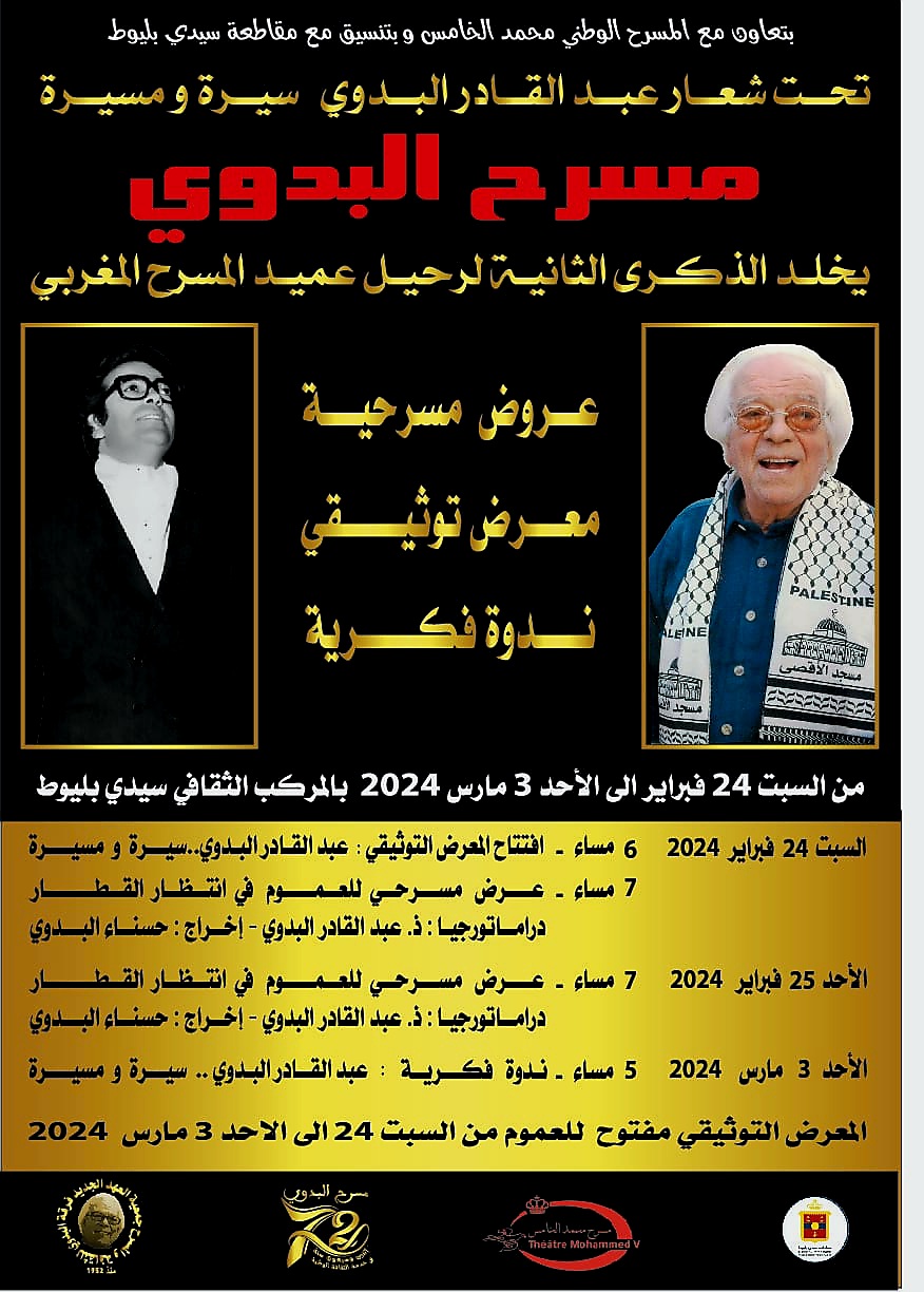 بتعاون مع المسرح الوطني محمد الخامس، وبتنسيق مع مقاطعة سيدي بليوط، يخلد مسرح البدوي الذكرى الثانية لرحيل عميد المسرح المغربي، تحت شعار: عبد القادر البدوي سيرة ومسيرة.