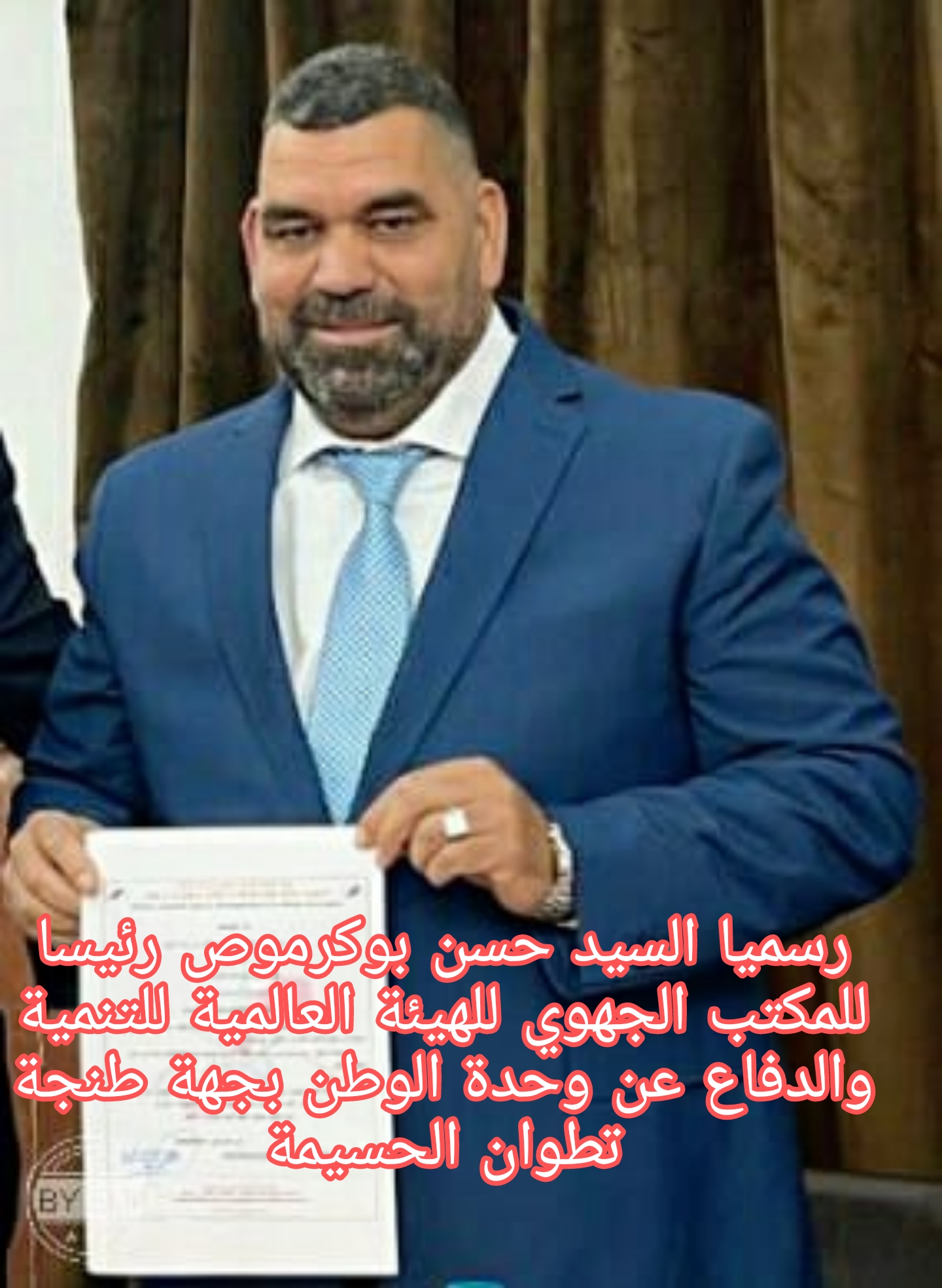 هنيئا للسيد حسن بوكرموص الرئيس الجديد للمكتب الجهوي للهيئة العالمية للتنمية والدفاع عن وحدة الوطن ،لجهة طنجة تطوان الحسيمة
