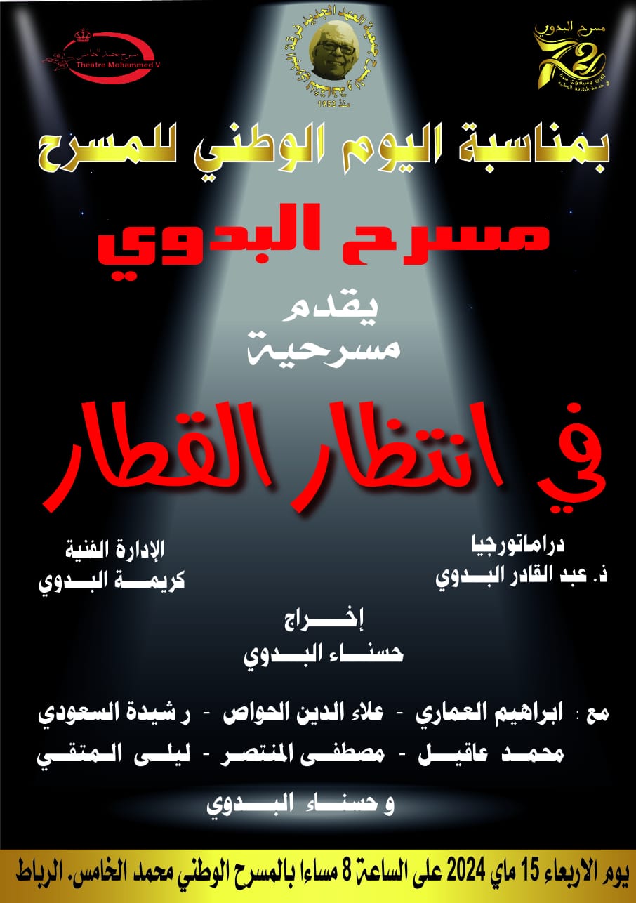 مباشرة بعد افتتاح المعرض سيقدم مسرح البدوي بهذه المناسبة على خشبة المسرح الوطني محمد الخامس ابتداء من الساعة الثامنة مساء عرضا جديدا لمسرحية” في انتظار القطار”.