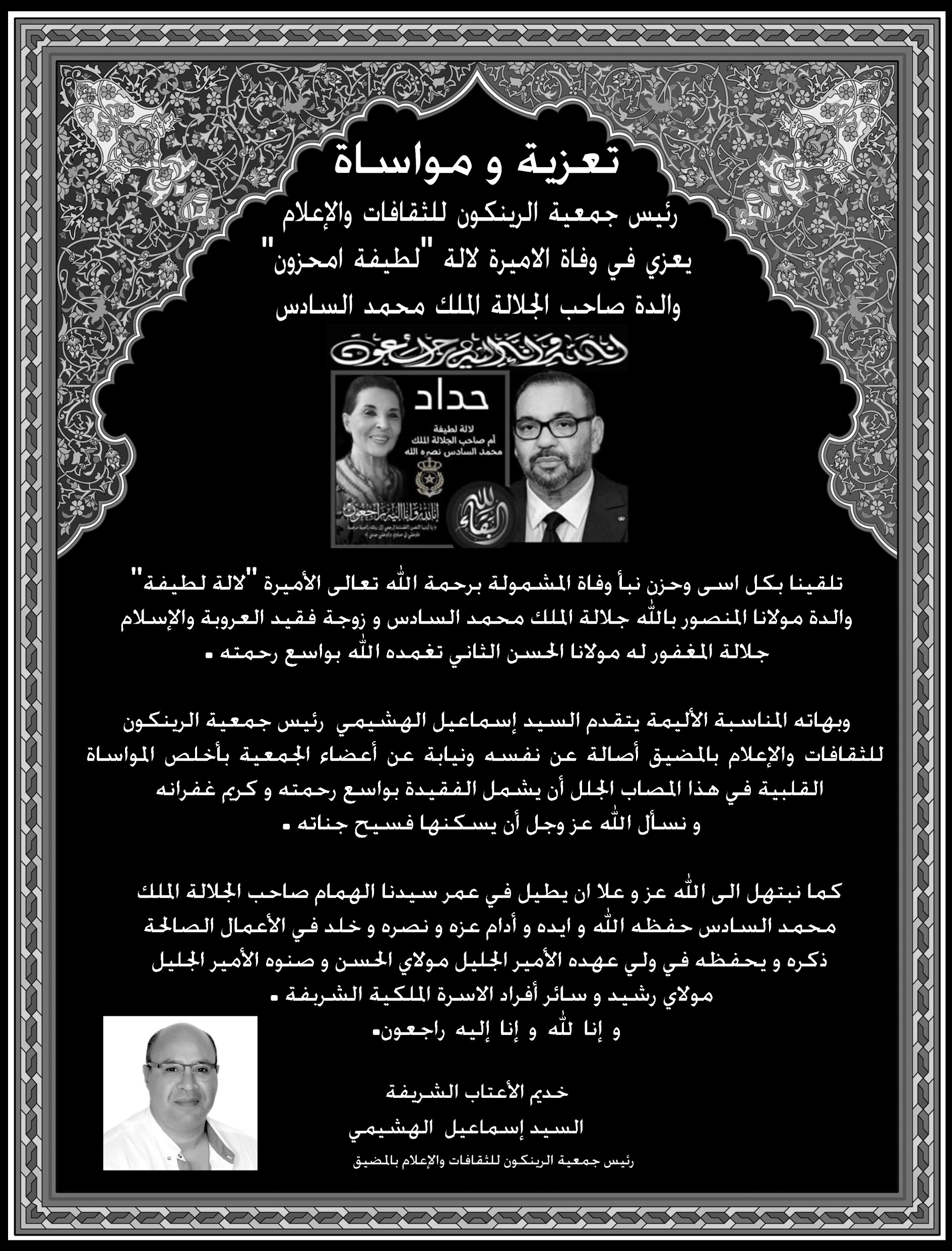 السيد إسماعيل الهشيمي رئيس جمعية الرينكون للثقافات والإعلام بالمضيق يعزي في وفاة الأميرة لالة لطيفة أمحزون والدة صاحب الجلالة الملك محمد السادس