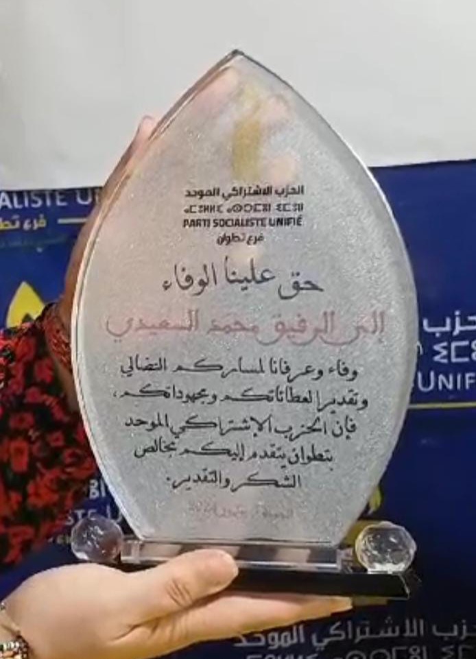 نظم مكتب الحزب الاشتراكي الموحد فرع تطوان يوم الجمعة 5 يوليوز 2024 بمقر الحزب، نشاطا تكريميا للرفيق محمد السعيدي، في إطار مشروع “حق علينا الوفاء” الذي يهدف إلى الاعتراف بما قدموه للحزب واليسار عموما وتكريم ثلة من مناضلي ومناضلات الفرع والاحتفاء بهم.