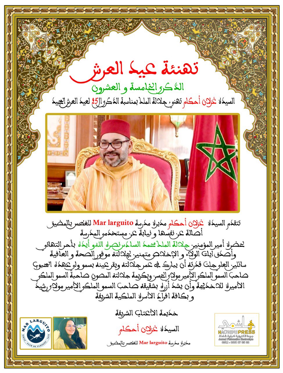 خادمة الأعتاب الشريفة السيدة “ غزلان أحكام ” تهنئ صاحب الجلالة بمناسبة ذكرى عيد العرش المجيد في يوليو 31- 2024 0 405 انشر 0 405 انشر