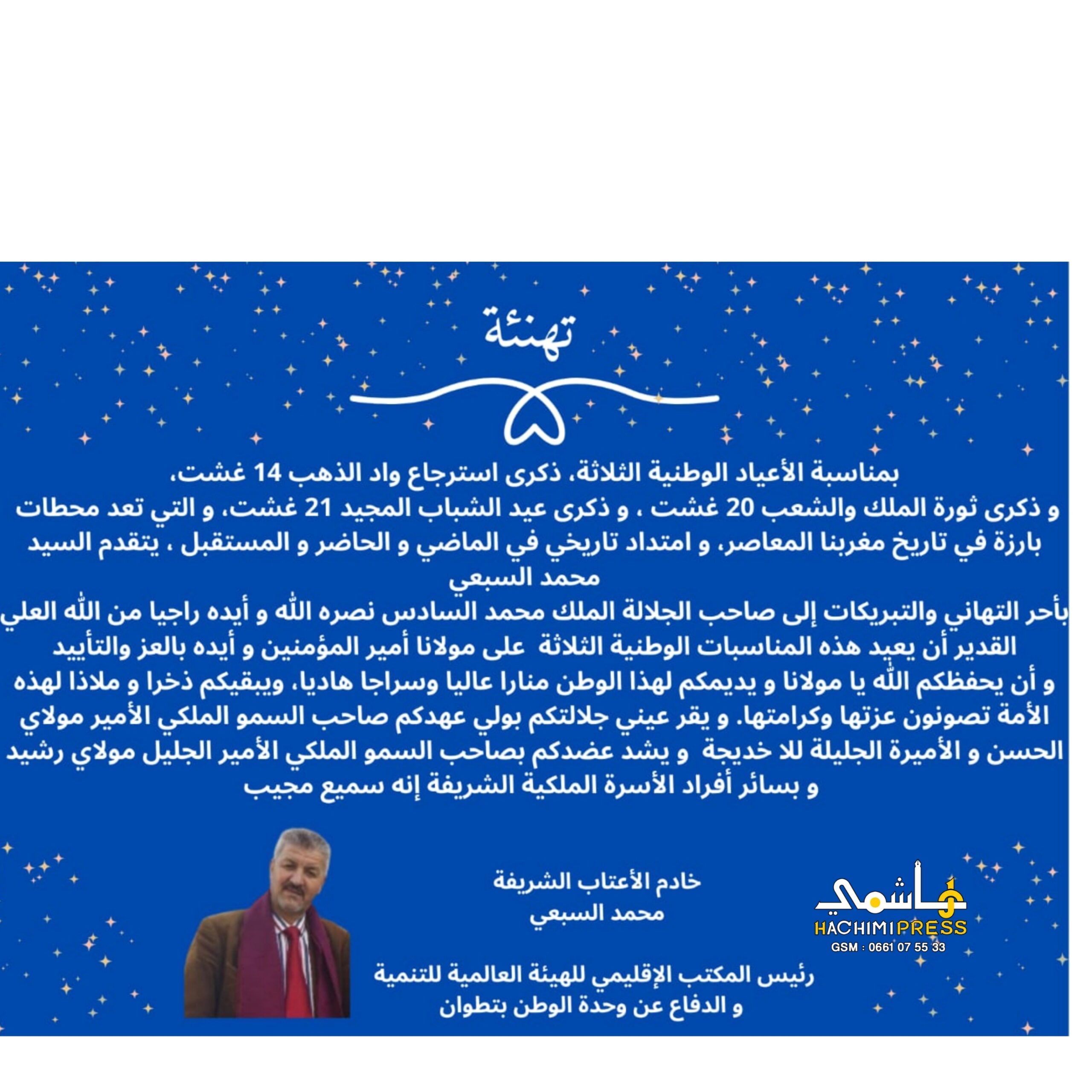 يتقدم السيد محمد السبعي بأحر التهاني والتبريكات إلى صاحب الجلالة الملك محمد السادس نصره الله و أيده راجيا من الله العلي القدير أن يعيد هذه المناسبات الوطنية الثلاثة على مولانا أمير المؤمنين