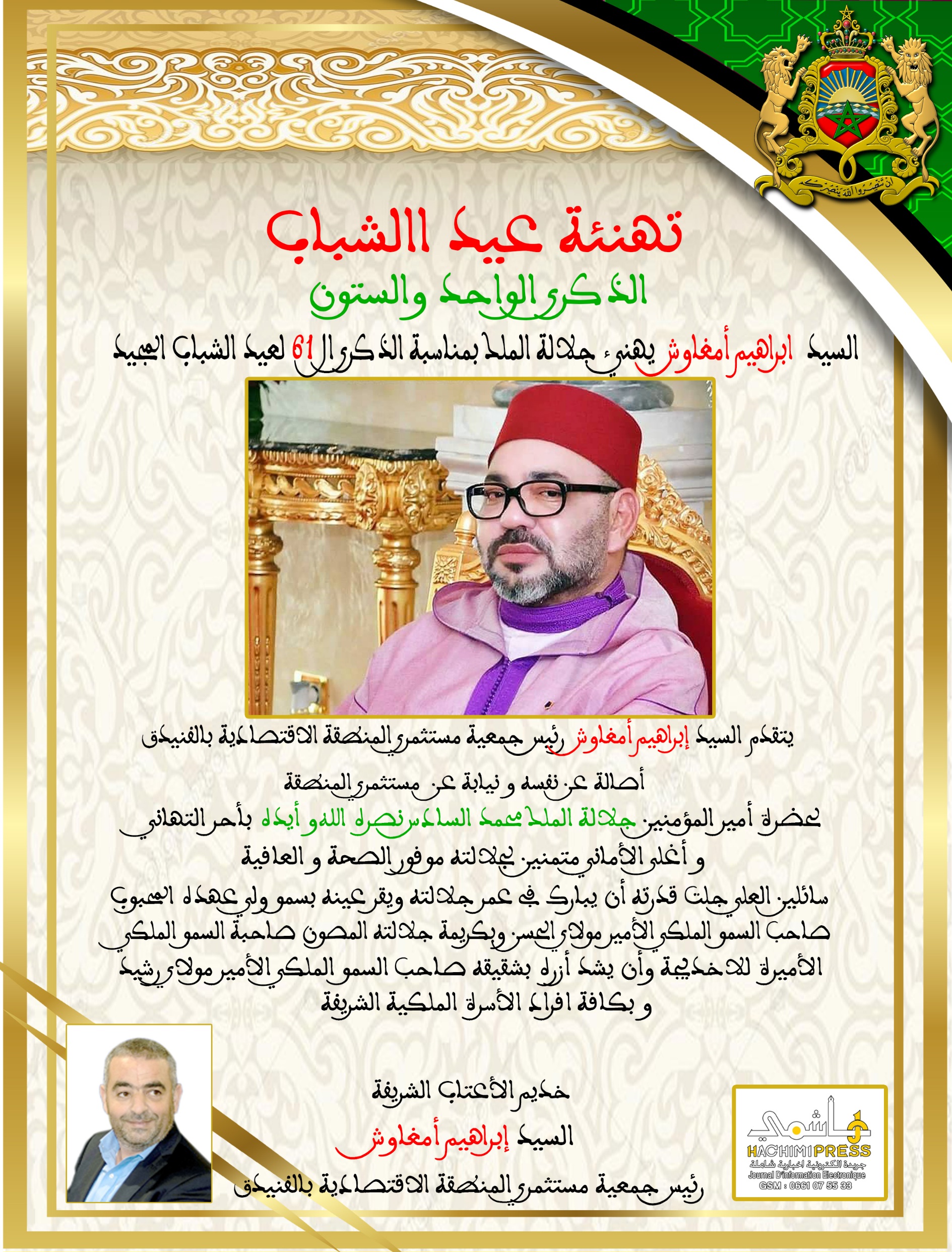 السيد أبراهيم امغاوش رئيس جمعية مستثمري المنطقة الإقتصادية بالفنيدق يهنئ جلالة الملك بمناسبة الذكرى ال 61 لعيد الشباب المجيد آخر تحديث أغسطس 21- 2024 0 325 انشر 0 325 انشر