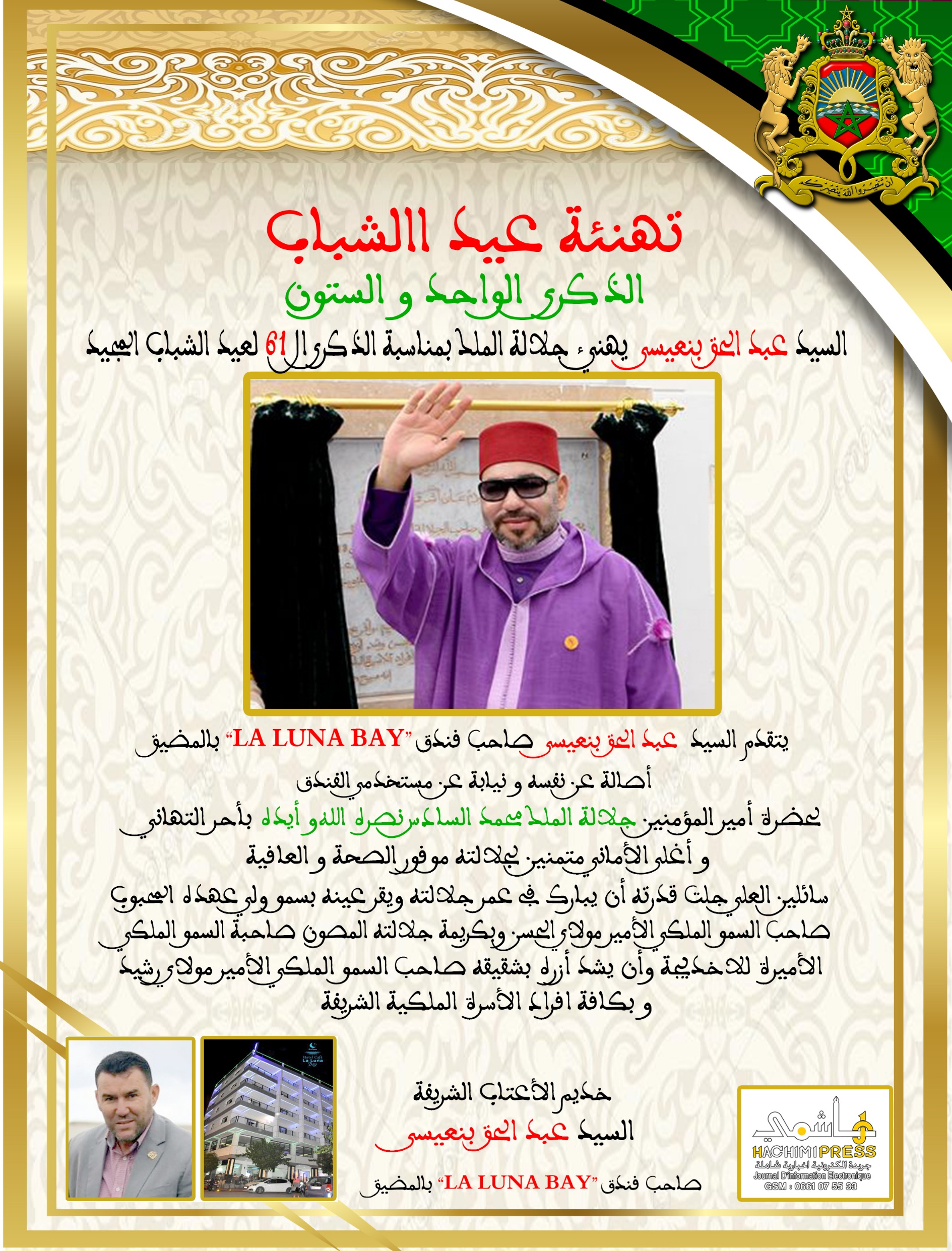 السيد عبد الحق بنعيسى صاحب فندق La luna bay بالمضيق يهنئ جلالة الملك بمناسبة الذكرى ال 61 لعيد الشباب المجيد في أغسطس 21- 2024 0 315 انشر 0 315 انشر