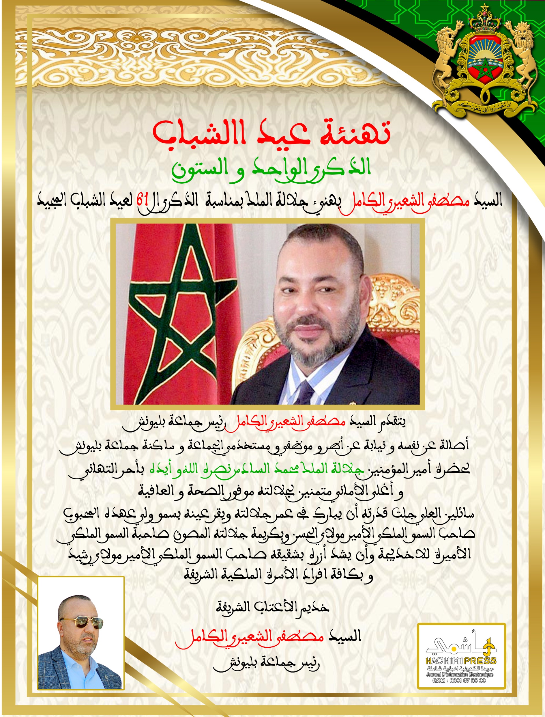 السيد مصطفى الشعيري الكامل رئيس جماعة بليونش يهنئ جلالة الملك بمناسبة الذكرى ال 61 لعيد الشباب المجيد في أغسطس 21- 2024 0 265 انشر 0 265 انشر