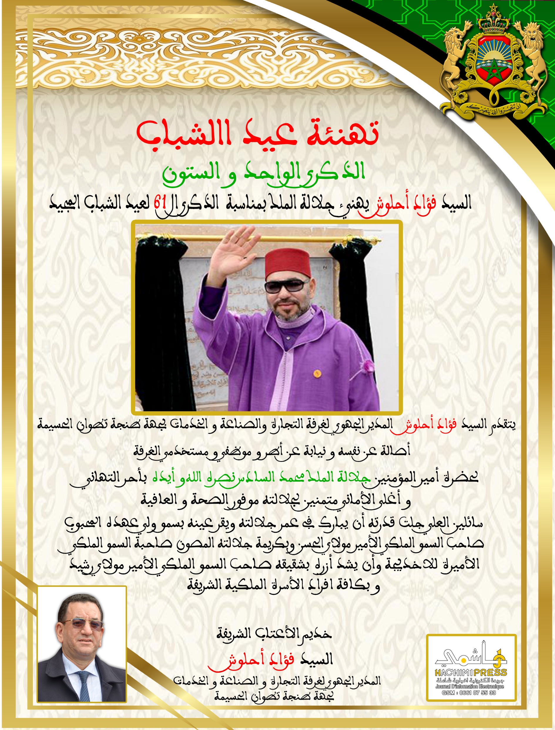 السيد فؤاد أحلوش المدير الجهوي لغرفة التجارة والصناعة والخدمات لجهة طنجة تطوان الحسيمة يهنئ جلالة الملك بمناسبة الذكرى ال 61 لعيد الشباب المجيد في أغسطس 21- 2024 0 324 انشر 0 324 انشر