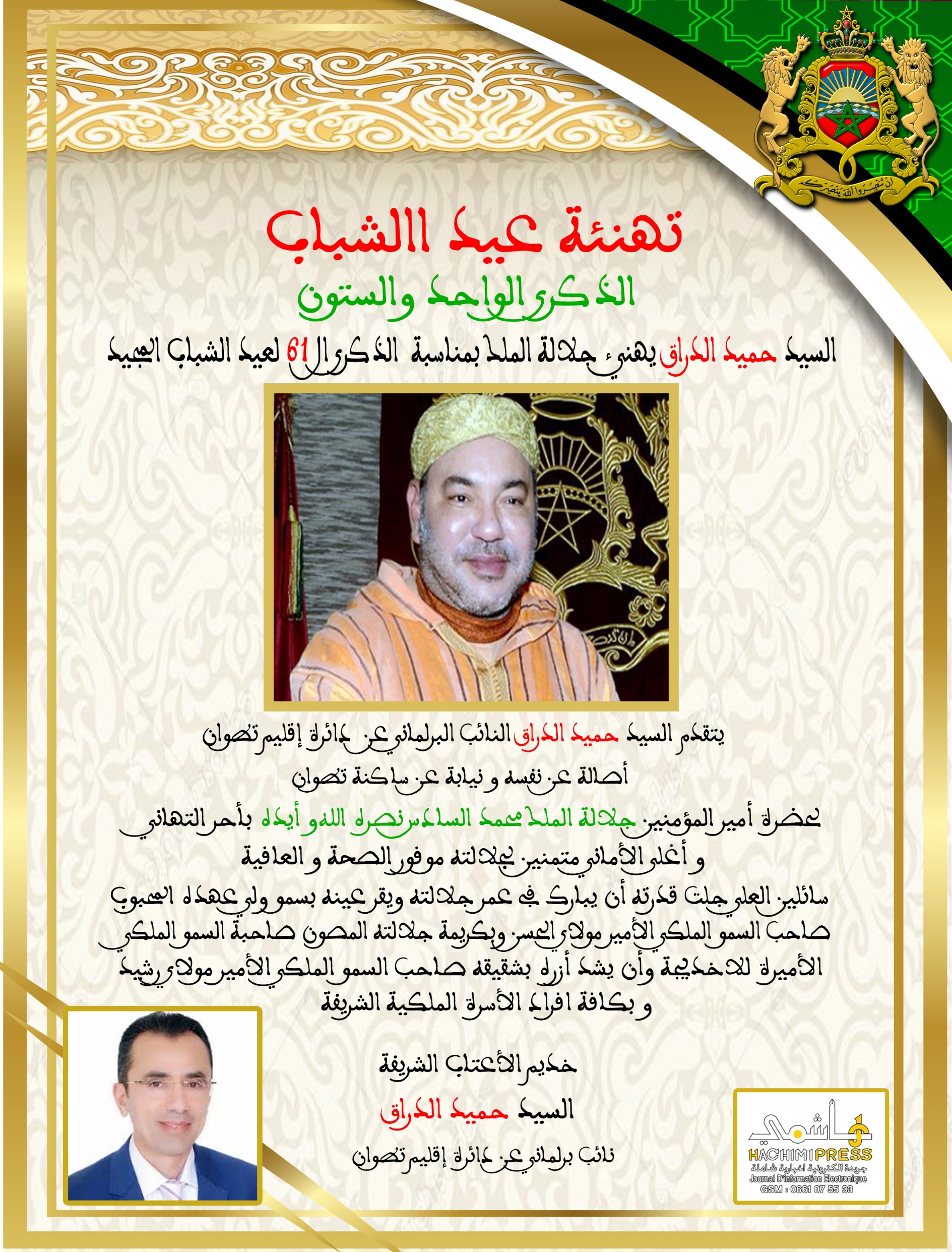 السيد حميد الدراق النائب البرلماني عن دائرة إقليم تطوان يهنئ جلالة الملك بمناسبة الذكرى ال 61 لعيد الشباب المجيد في أغسطس 21- 2024 0 256 انشر 0 256 انشر