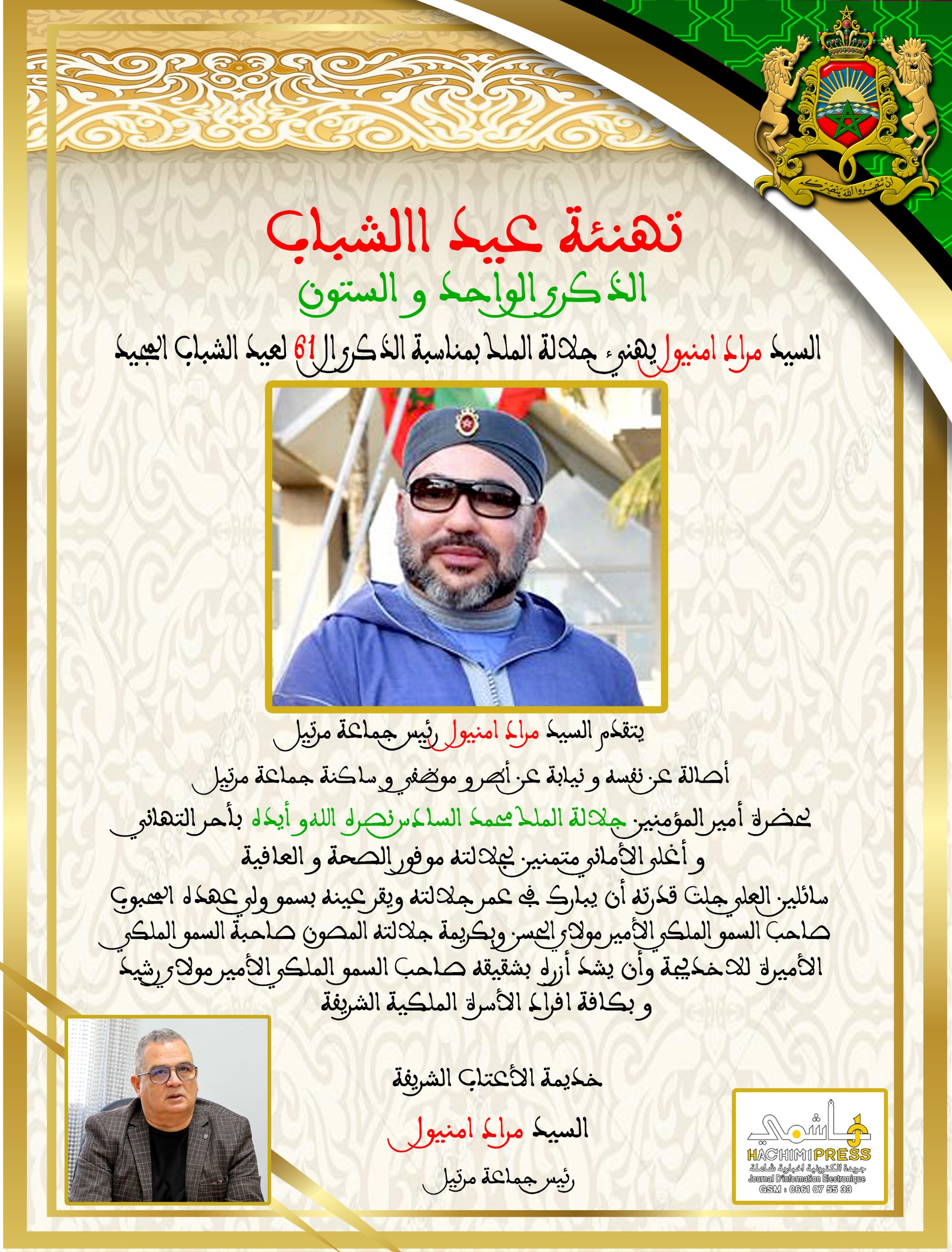السيد مراد منيول رئيس جماعة مرتيل يهنئ جلالة الملك بمناسبة الذكرى ال 61 لعيد الشباب المجيد في أغسطس 21- 2024 0 367 انشر 0 367 انشر