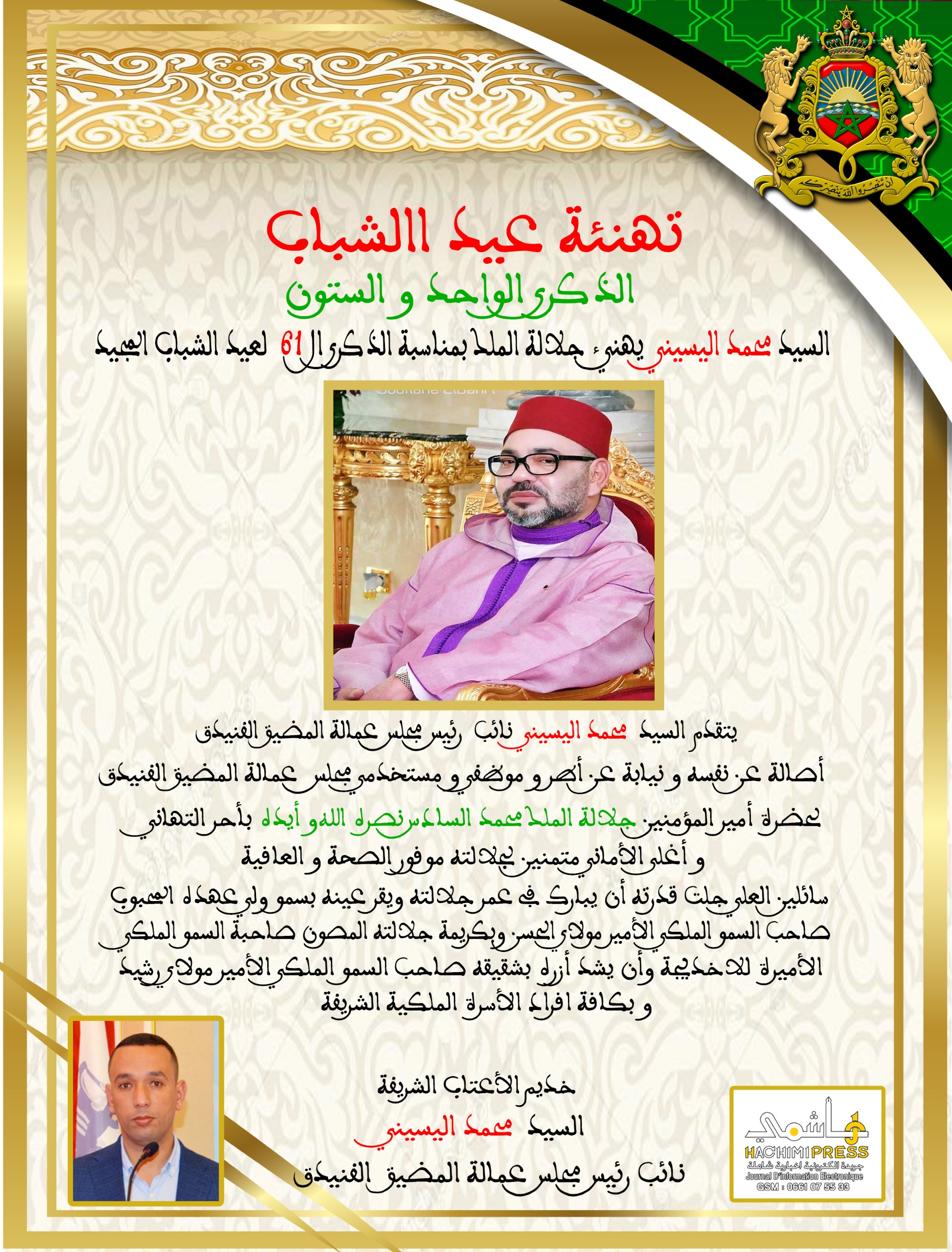 السيد محمد اليسيني نائب رئيس مجلس عمالة المضيق فنيدق يهنئ جلالة الملك بمناسبة الذكرى ال 61 لعيد الشباب المجيد