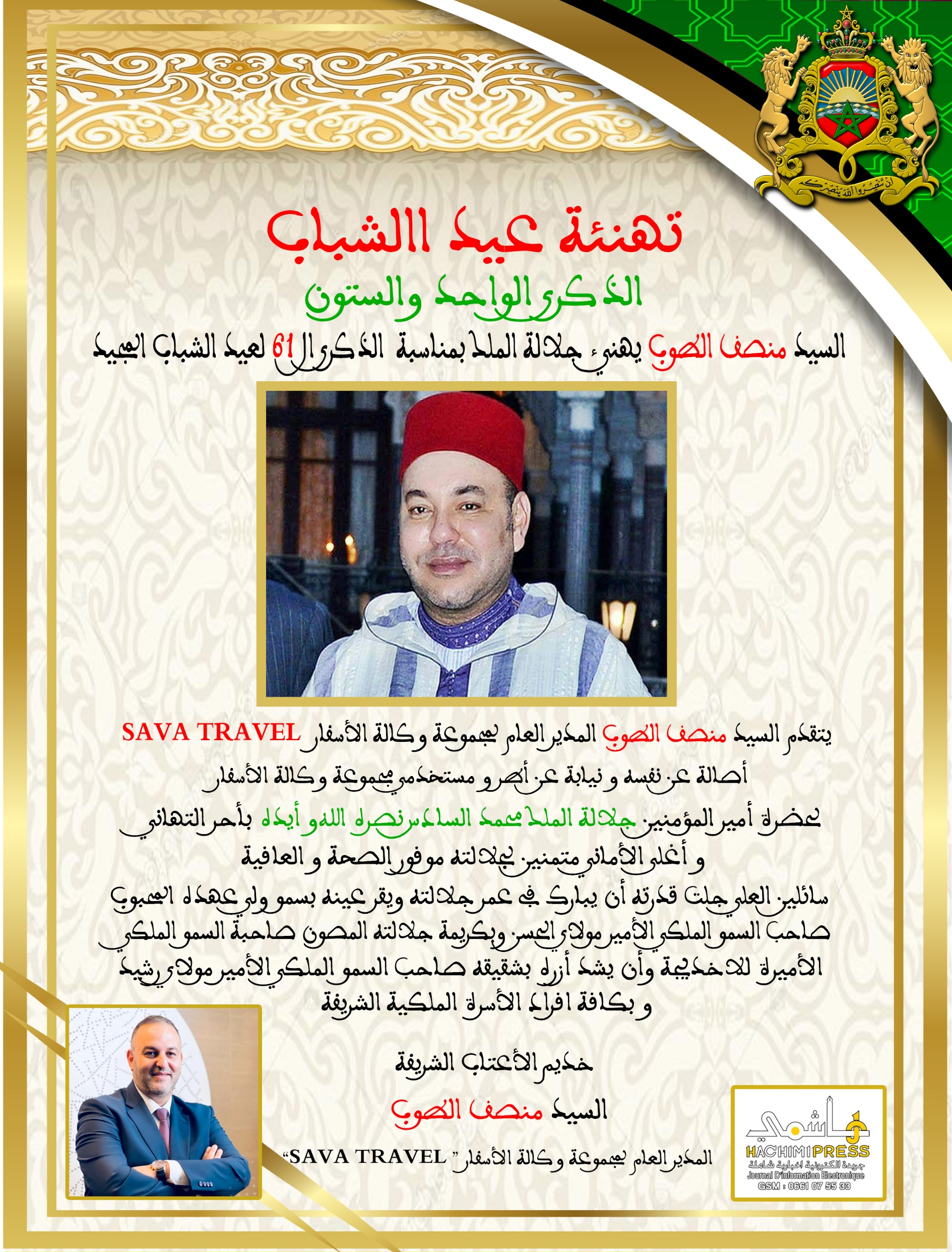 السيد منصف الطوب المدير العام لمجموعة وكالة الأسفار ” Sava Travell ” يهنئ جلالة الملك بمناسبة الذكرى ال 61 لعيد الشباب المجيد في أغسطس 21- 2024 0 428 انشر 0 428 انشر