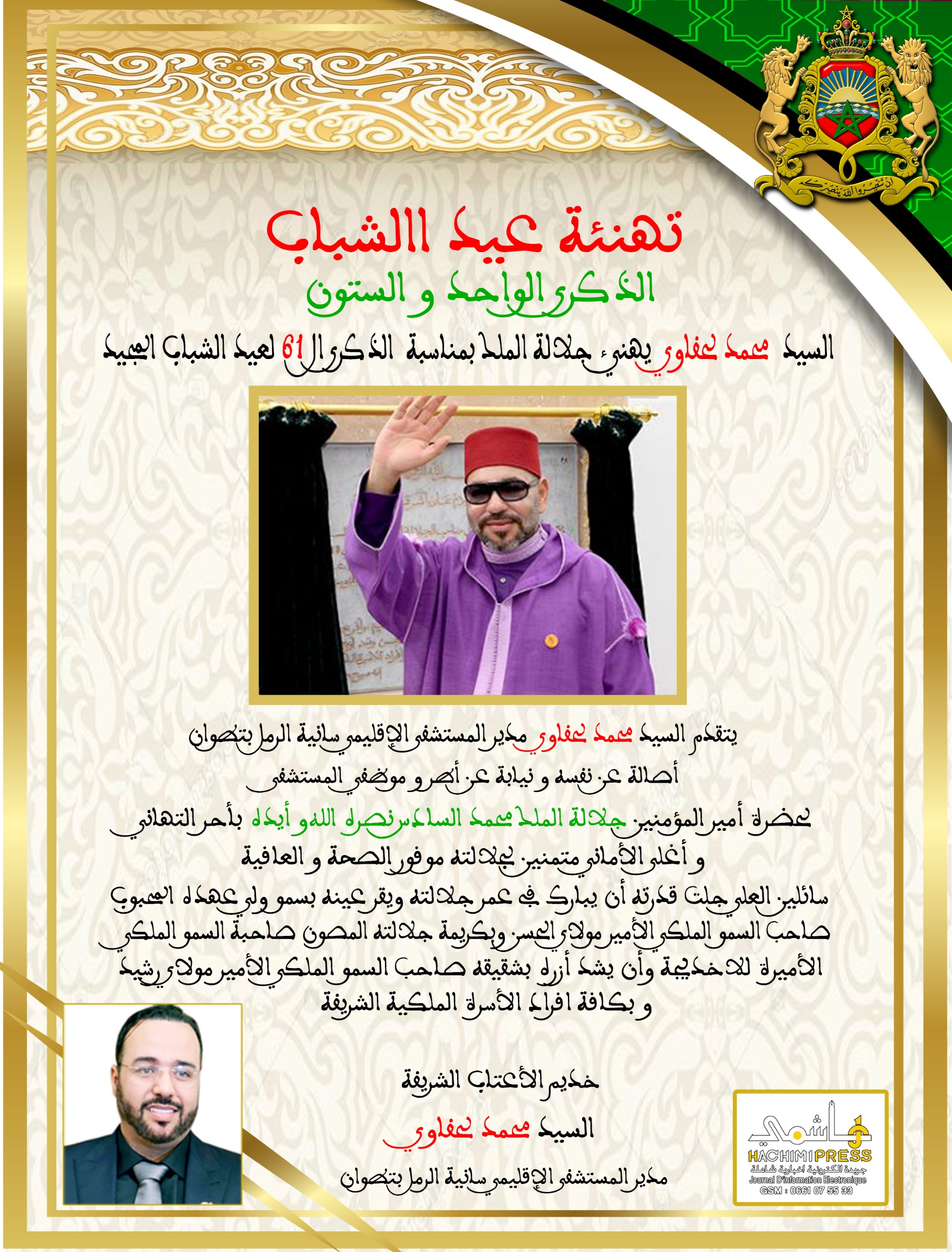 السيد محمد لحفاوي مدير المستشفى الاقليمي سانية الرمل بتطوان يهنئ جلالة الملك بمناسبة الذكرى ال 61 لعيد الشباب المجيد في أغسطس 21- 2024 0 428 انشر 0 428 انشر