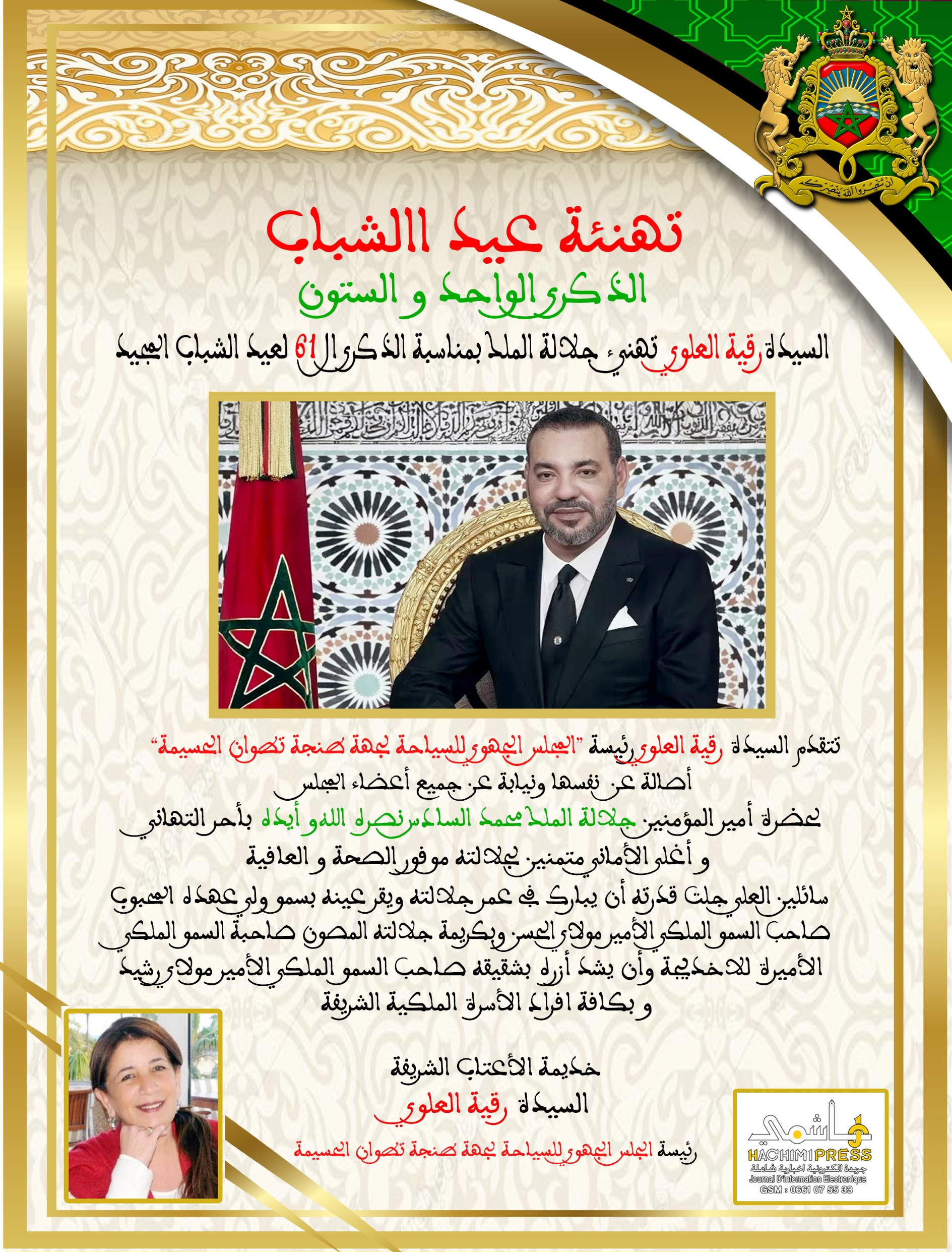 السيدة رقية العلوي رئيسة المجلس الجهوي للسياحة بجهة طنجه تطوان الحسيمة تهنئ جلالة الملك بمناسبة الذكرى ال 61 لعيد الشباب المجيد في أغسطس 21- 2024 0 287 انشر 0 287 انشر