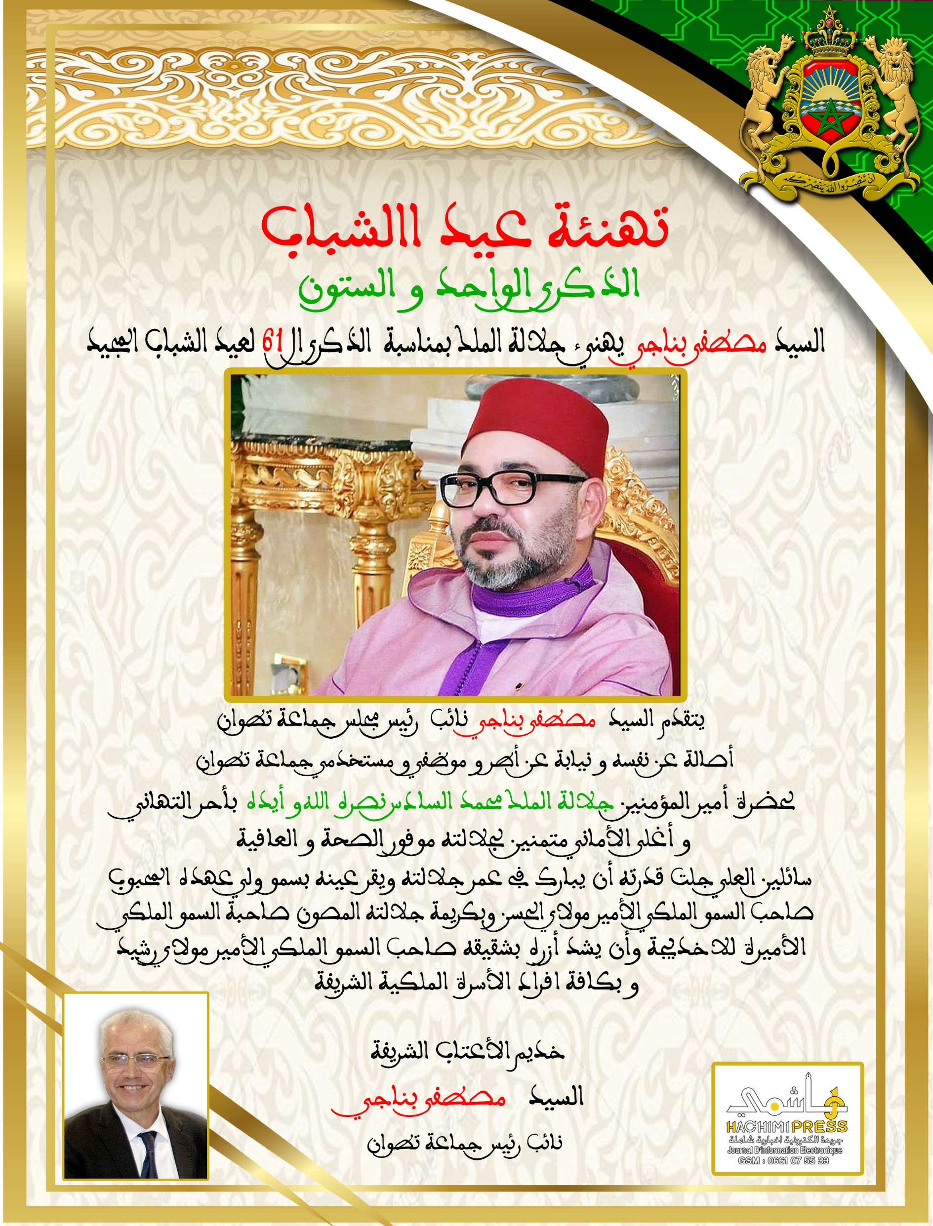 السيد مصطفى بناجي نائب رئيس جماعة تطوان يهنئ جلالة الملك بمناسبة الذكرى ال 61 لعيد الشباب المجيد في أغسطس 21- 2024 0 327 انشر 0 327 انشر
