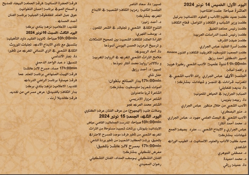 ضيفة الشرف: الأكاديمية الدكتورة جميلة رزقي، وينعقد هذا المهرجان أيام 16/15/14 نونبر 2024، ويشمل ندوات علمية، وقراءات شعرية، وورشات شعبية مستوحاة من التراث المغربي الشعبي، وعروض مسرحية، ومعرض للفن التشكيلي، وعروض غنائية…