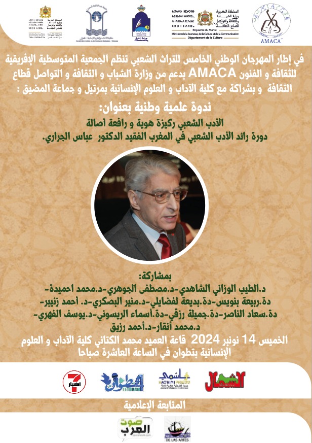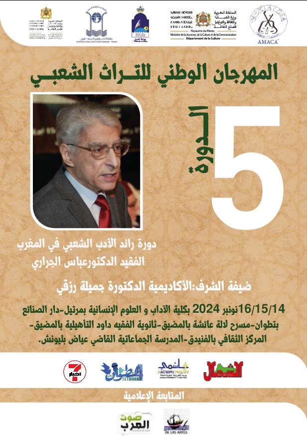 بشراكة مع كلية الآداب والعلوم الإنسانية بتطوان، ووزارة الشباب والثقافة والتواصل، قطاع الثقافة، وجماعة المضيق، الدورة الخامسة من المهرجان الوطني للتراث الشعبي، دورة رائد الأدب الشعبي في المغرب، الفقيد الدكتور عباس الجراري.