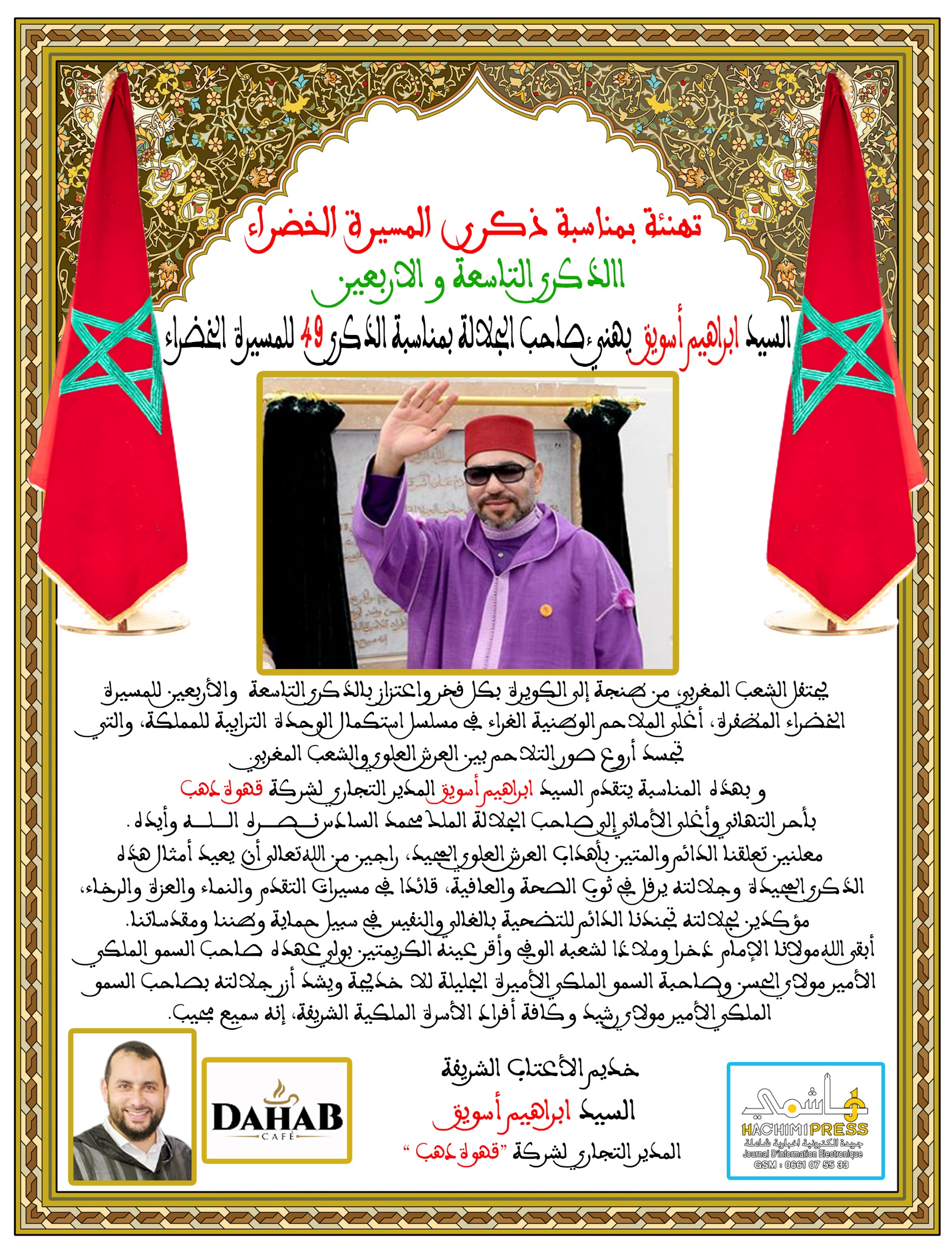 السيد إبراهيم أسويق المدير التجاري لشركة قهوة دهب يهنئ جلالة الملك بمناسبة الذكرى 49 للمسيرة الخضراء.