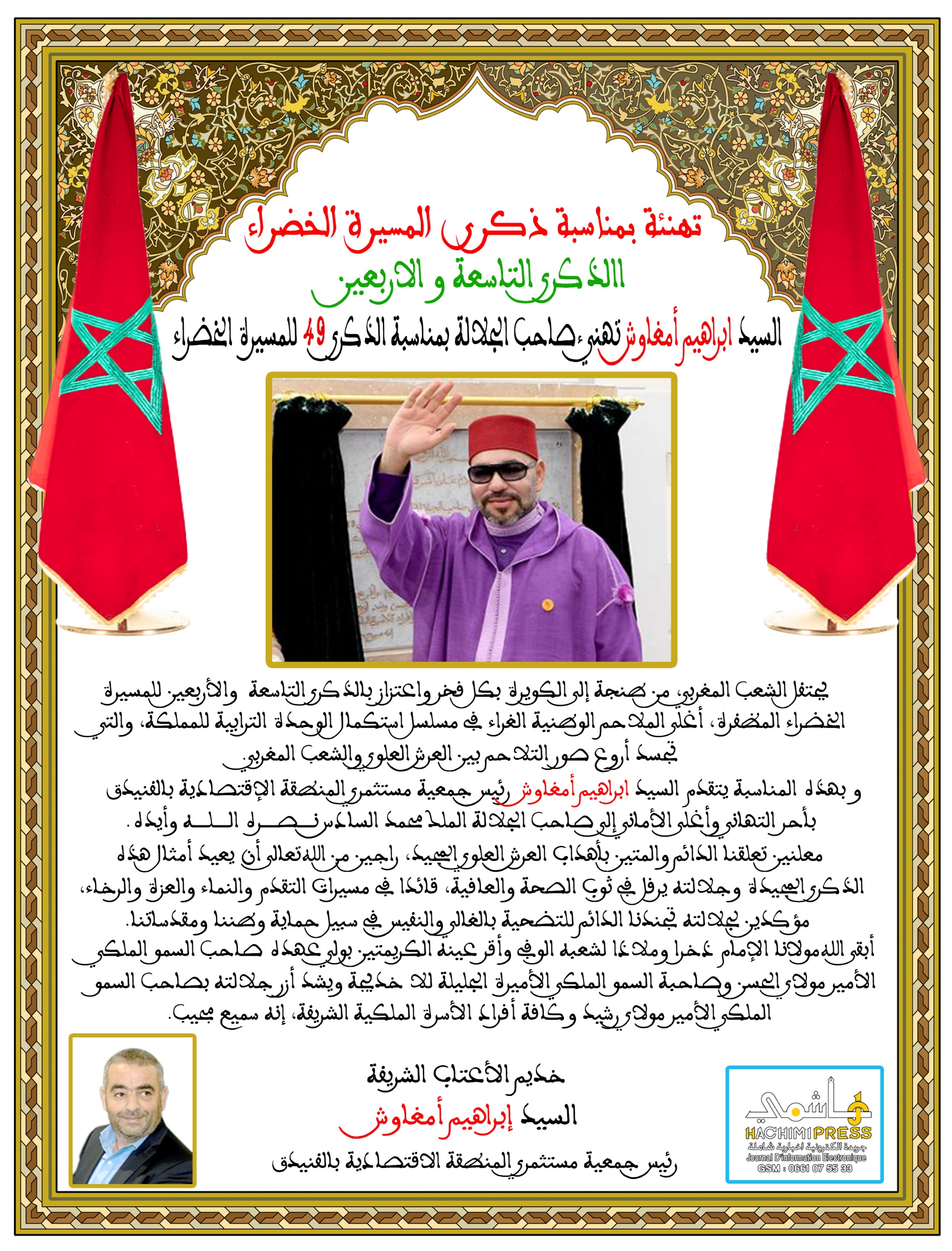 السيد إبراهيم أمغاوش رئيس جمعية مستثمري المنطقة الإقتصادية بالفنيدق يهنئ جلالة الملك بمناسبة الذكرى 49 للمسيرة الخضراء