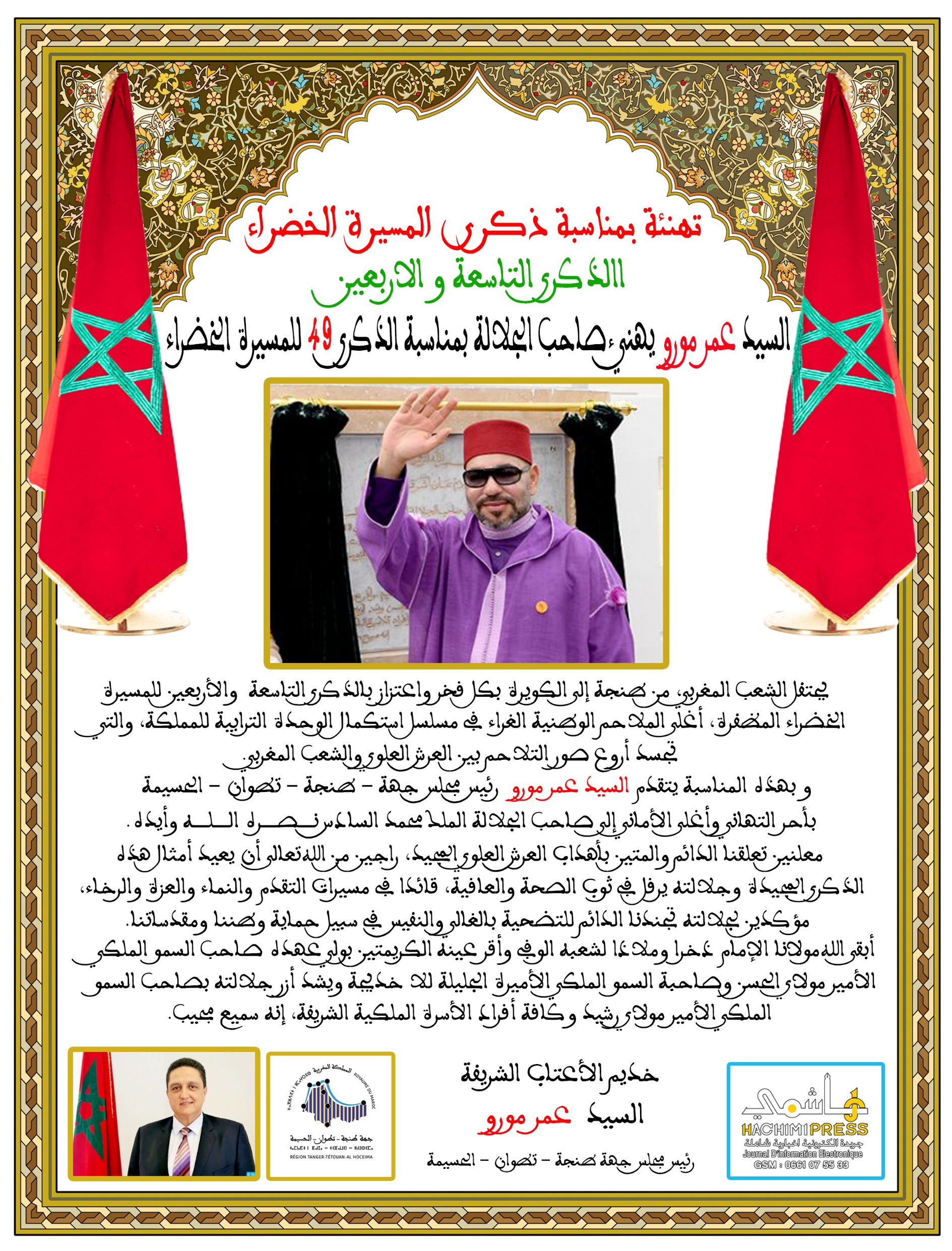 السيد عمر مورو رئيس مجلس جهة طنجة-تطوان-الحسيمة يهنئ جلالة الملك بمناسبة الذكرى 49 للمسيرة الخضراء