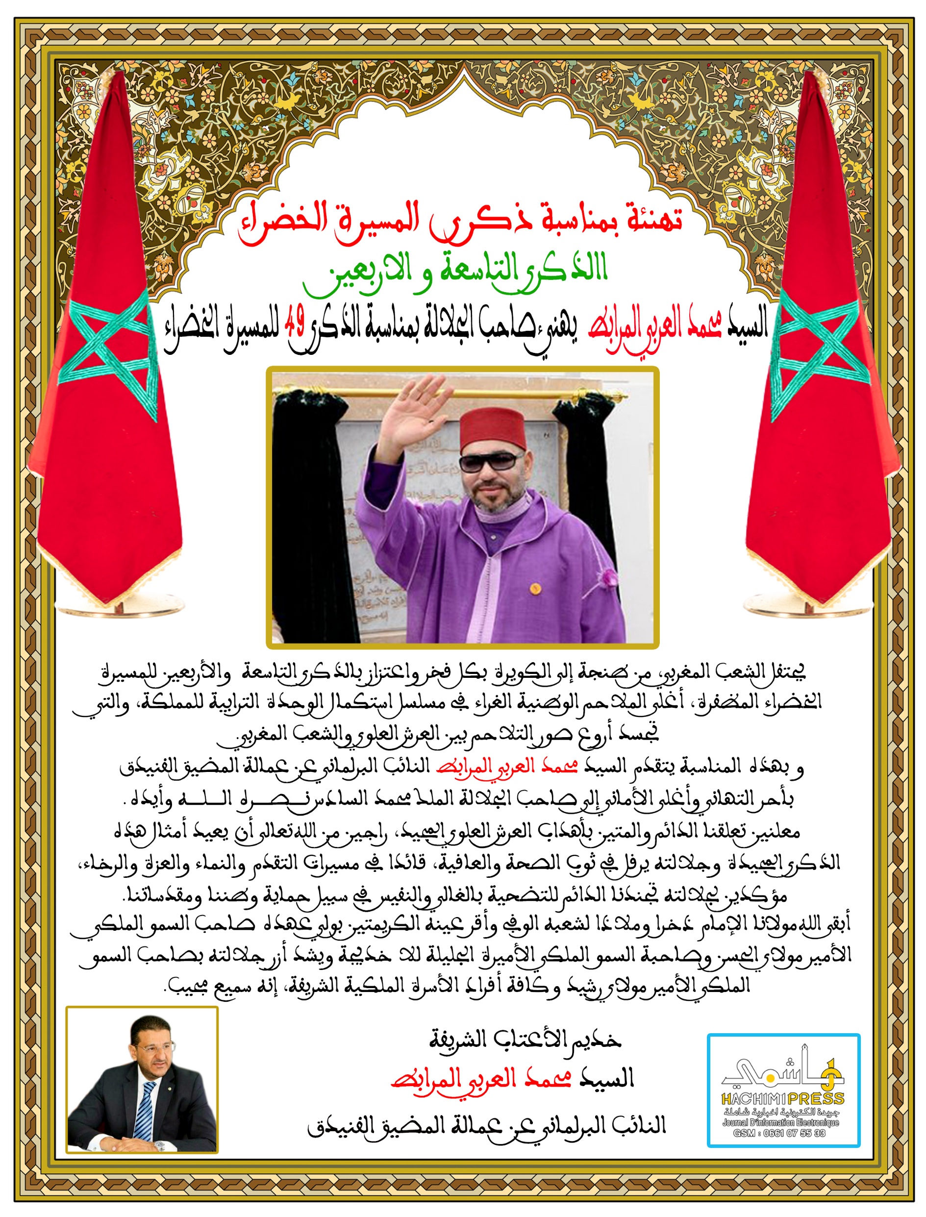 السيد محمد العربي المرابط النائب البرلماني عن عمالة المضيق-الفنيدق يهنئ جلالة الملك بمناسبة الذكرى 49 للمسيرة الخضراء