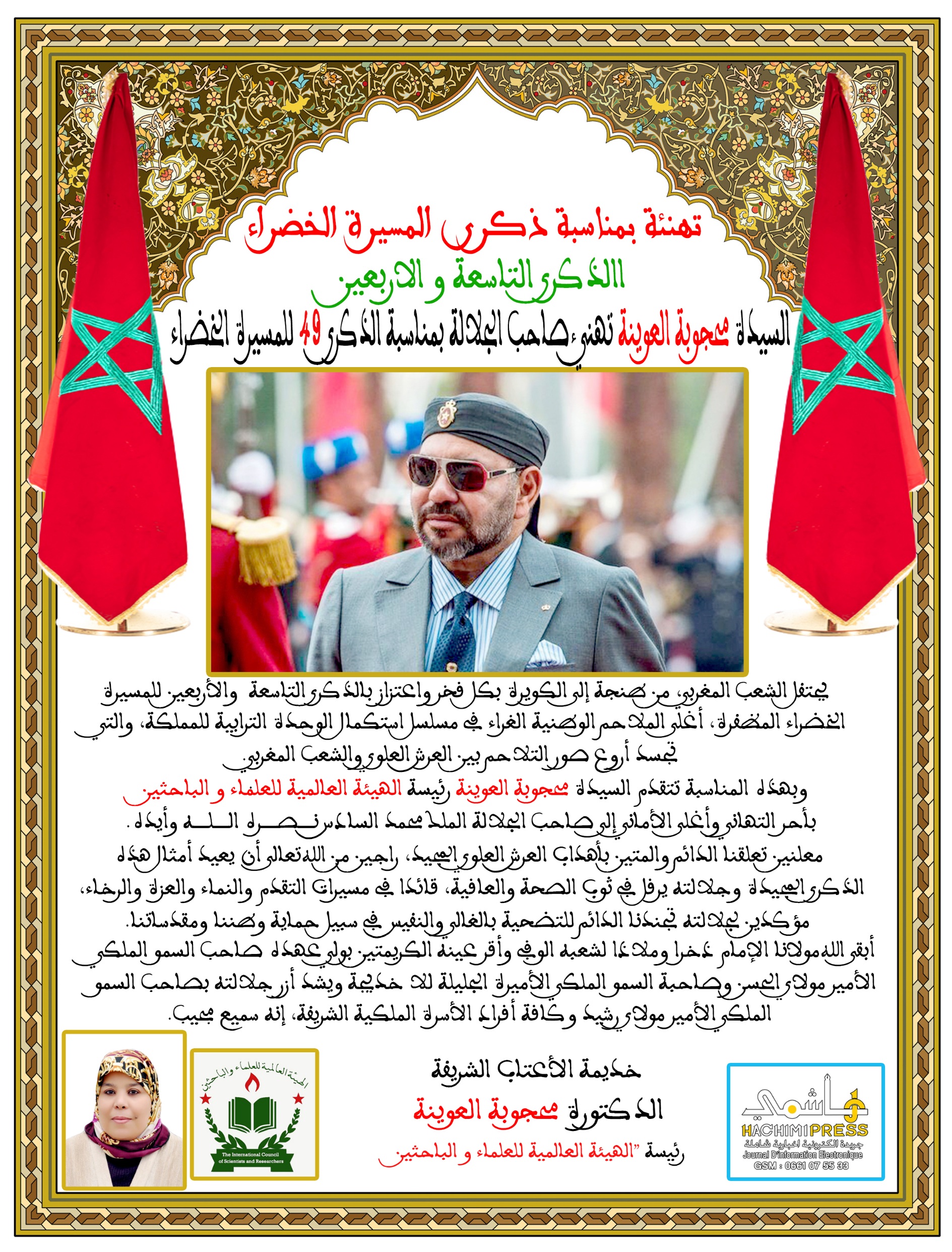السيدة محجوبة العوينة رئيسة الهيئة العالمية للعلماء والباحثين تهنئ جلالة الملك بمناسبة الذكرى 49 للمسيرة الخضراء