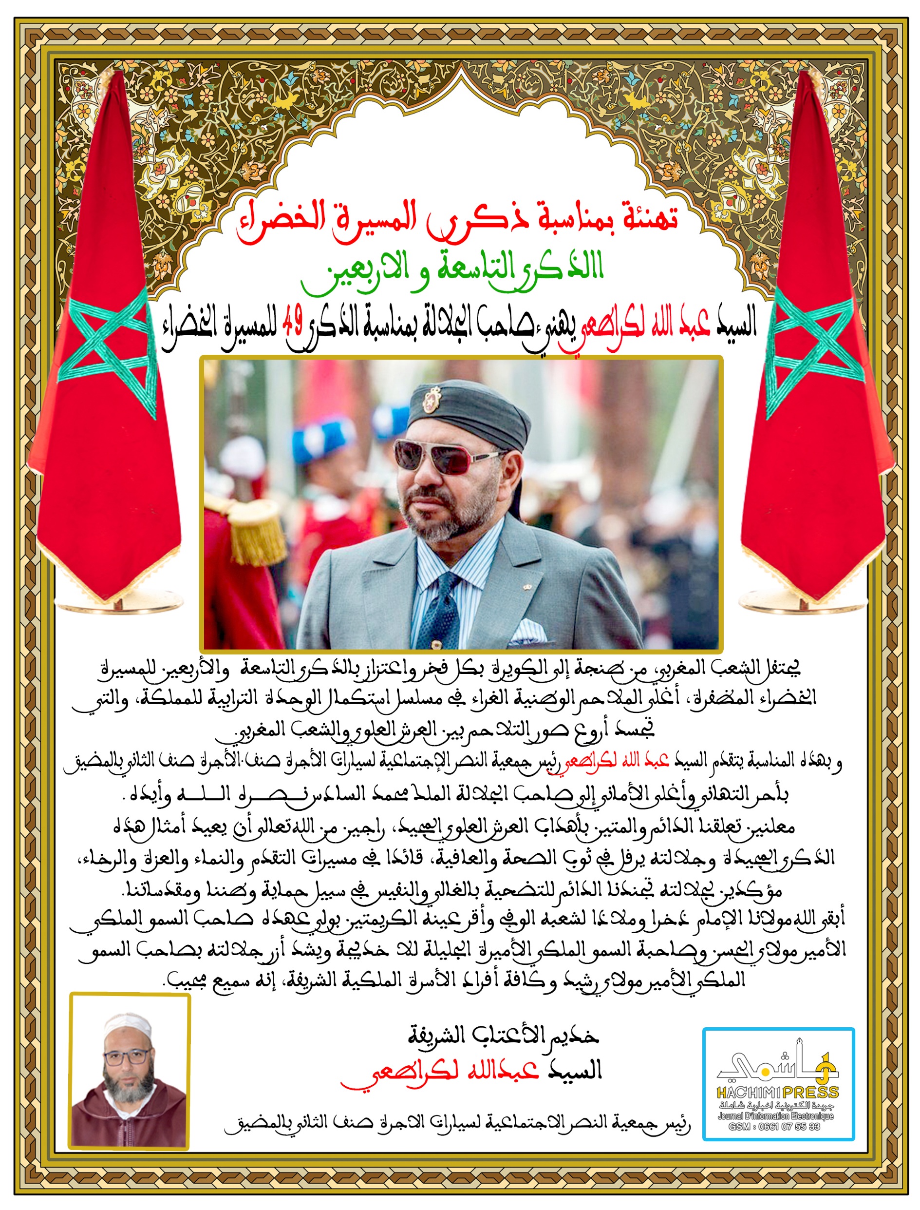 السيد عبد الله لكراطعي رئيس جمعية النصر الإجتماعية لسيارات الأجرة صنف الثاني بالمضيق يهنئ جلالة الملك بمناسبة الذكرى 49 للمسيرة الخضراء