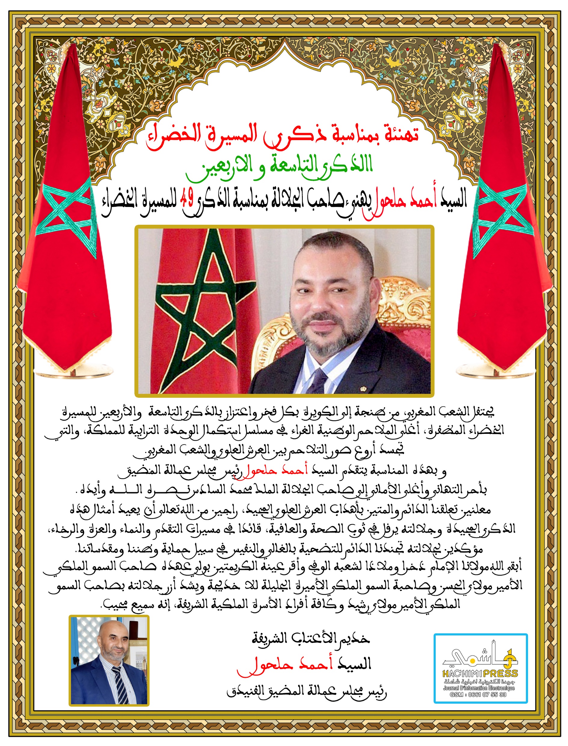 السيد أحمد حلحول رئيس مجلس عمالة المضيق-الفنيدق يهنئ جلالة الملك بمناسبة الذكرى 49 للمسيرة الخضراء