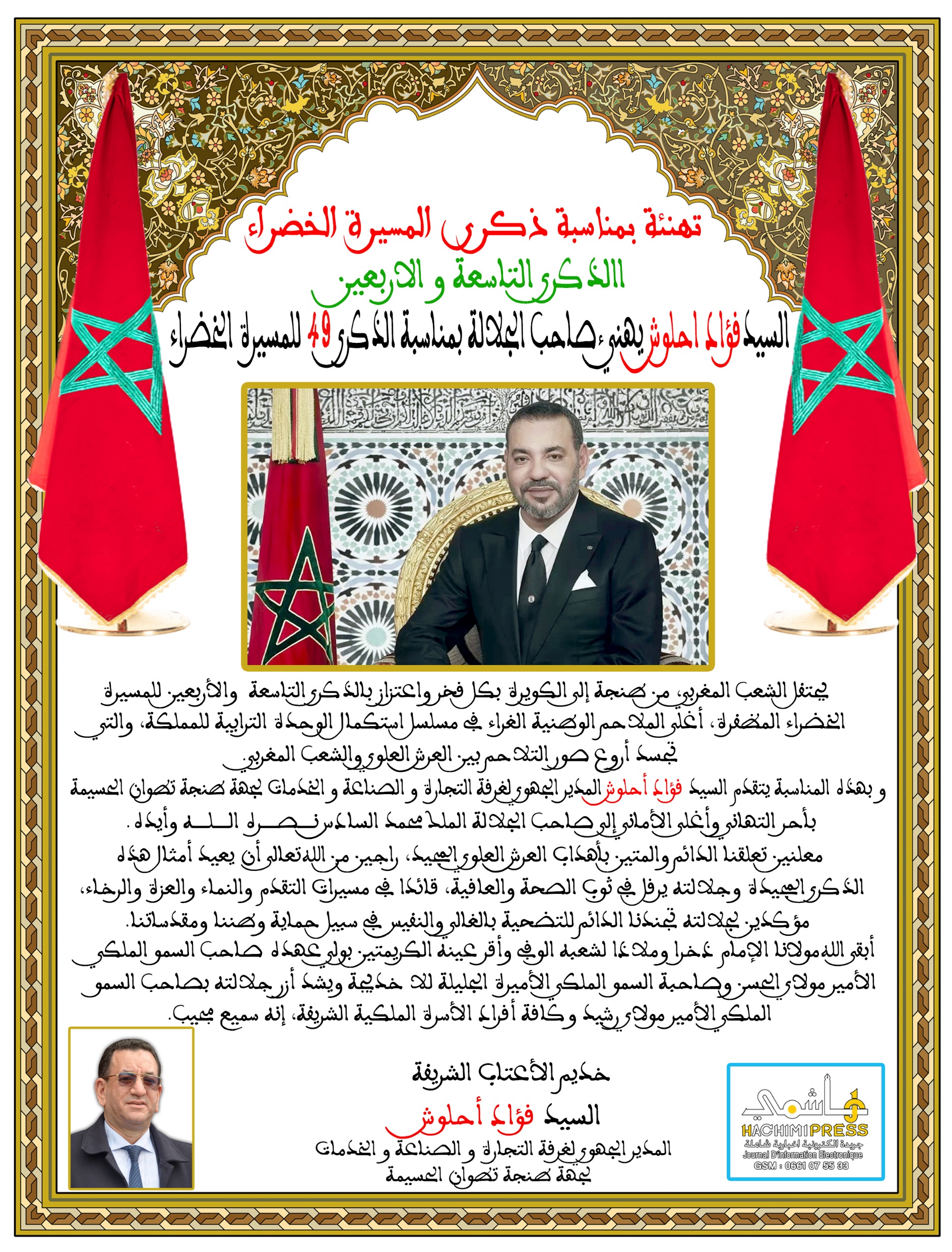 السيد فؤاد أحلوش المدير الجهوي لغرفة التجارة والصناعة والخدمات لجهة طنجة-تطوان-الحسيمة يهنئ جلالة الملك بمناسبة الذكرى 49 للمسيرة الخضراء