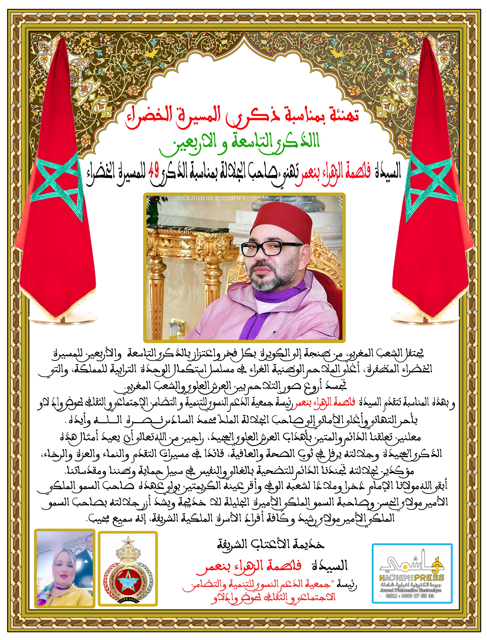 السيدة فاطمة الزهراء بنعمر رئيسة جمعية الدعم النسوي للتنمية والتضامن الإجتماعي والثقافي لحوض وادلاو تهنئ جلالة الملك بمناسبة الذكرى 49 للمسيرة الخضراء
