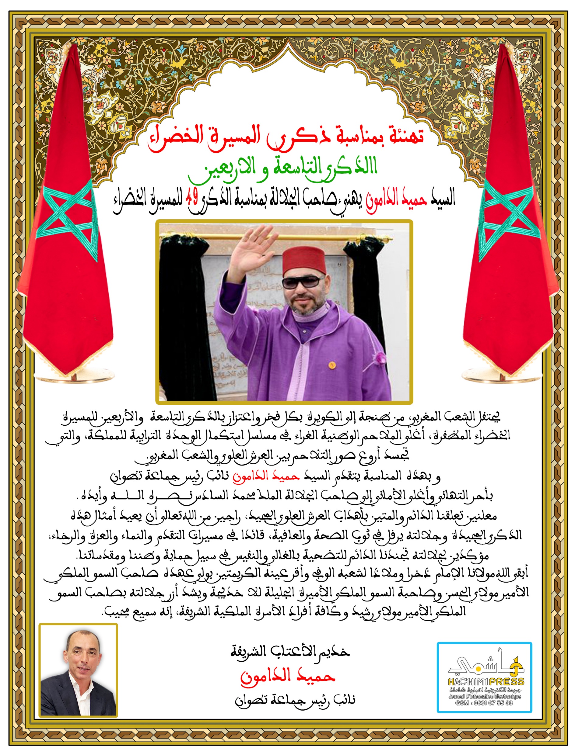 السيد حميد الدامون نائب رئيس جماعة تطوان يهنئ جلالة الملك بمناسبة الذكرى 49 للمسيرة الخضراء