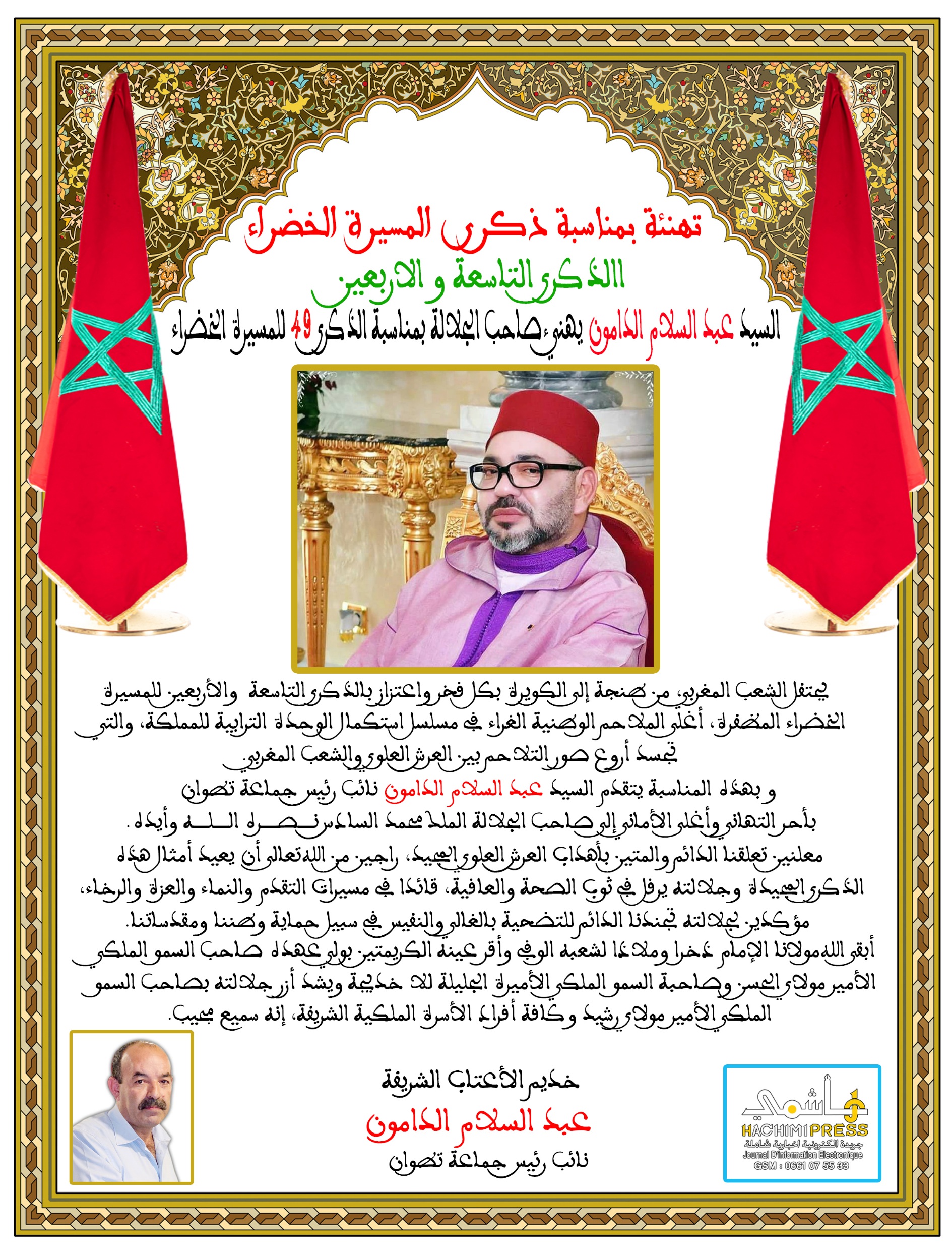 السيد عبد السلام الدامون نائب رئيس جماعة تطوان يهنئ جلالة الملك بمناسبة الذكرى 49 للمسيرة الخضراء