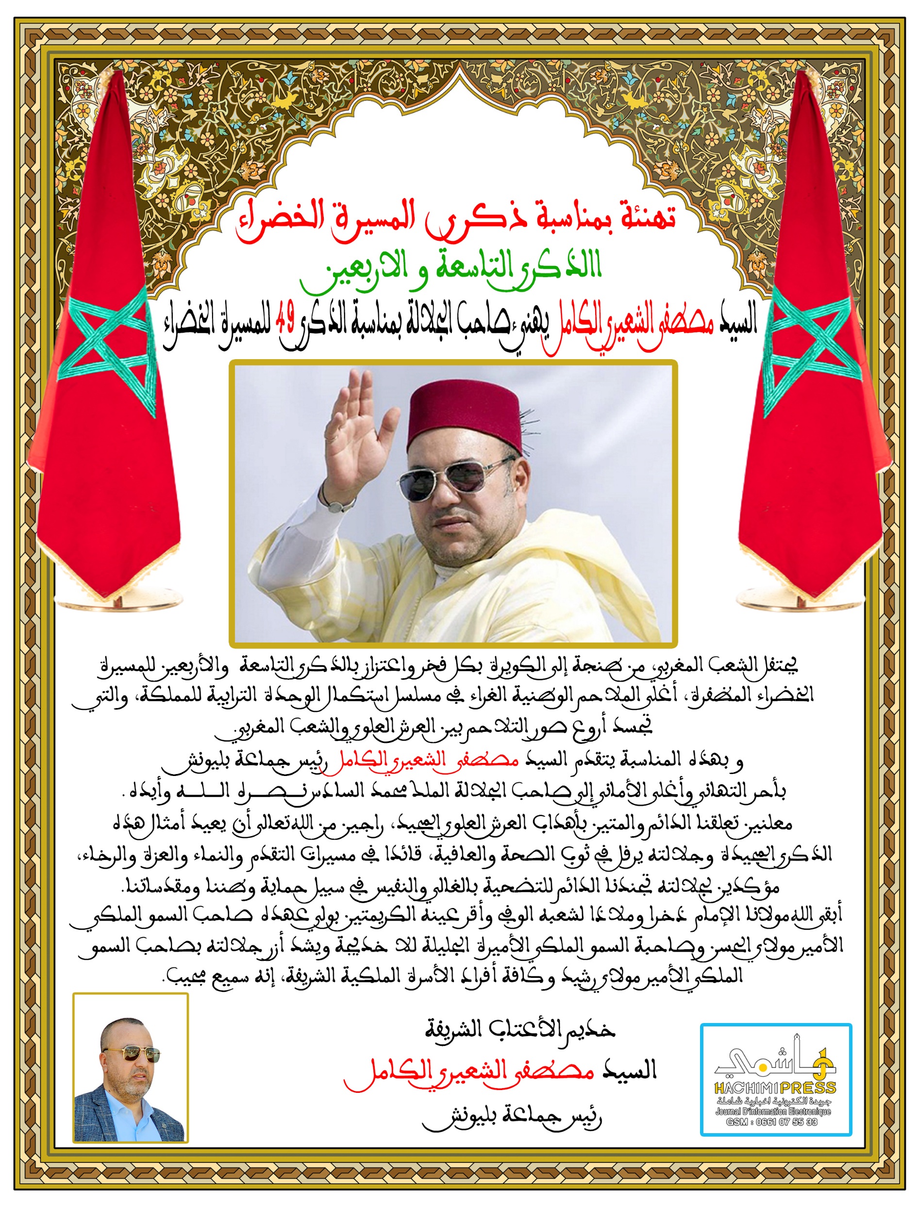 السيد مصطفى الشعيري الكامل رئيس جماعة بليونش يهنئ جلالة الملك بمناسبة الذكرى 49 للمسيرة الخضراء