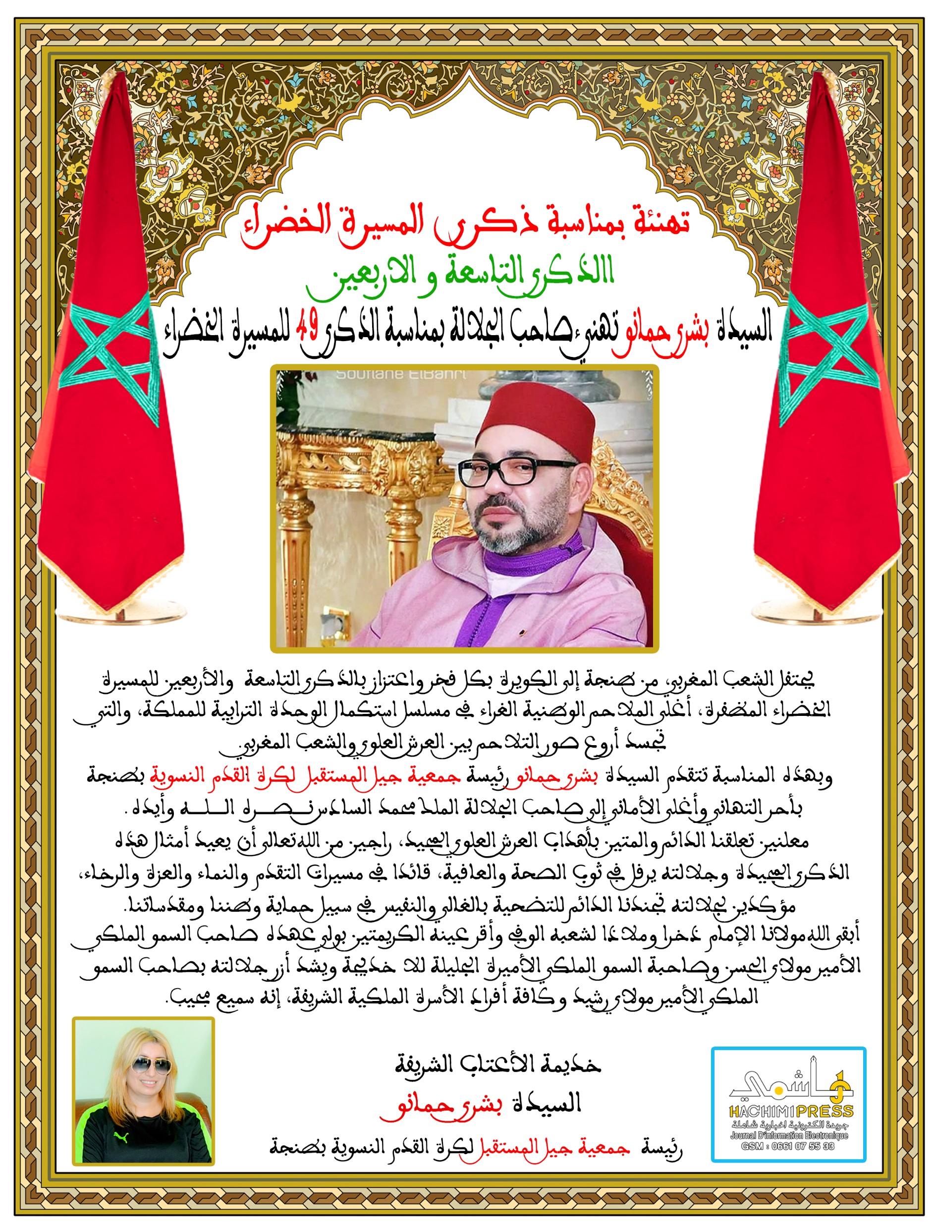 السيدة بشرى حمانو رئيسة جمعية جيل المستقبل لكرة القدم النسوية بطنجة تهنئ جلالة الملك بمناسبة الذكرى 49 للمسيرة الخضراء