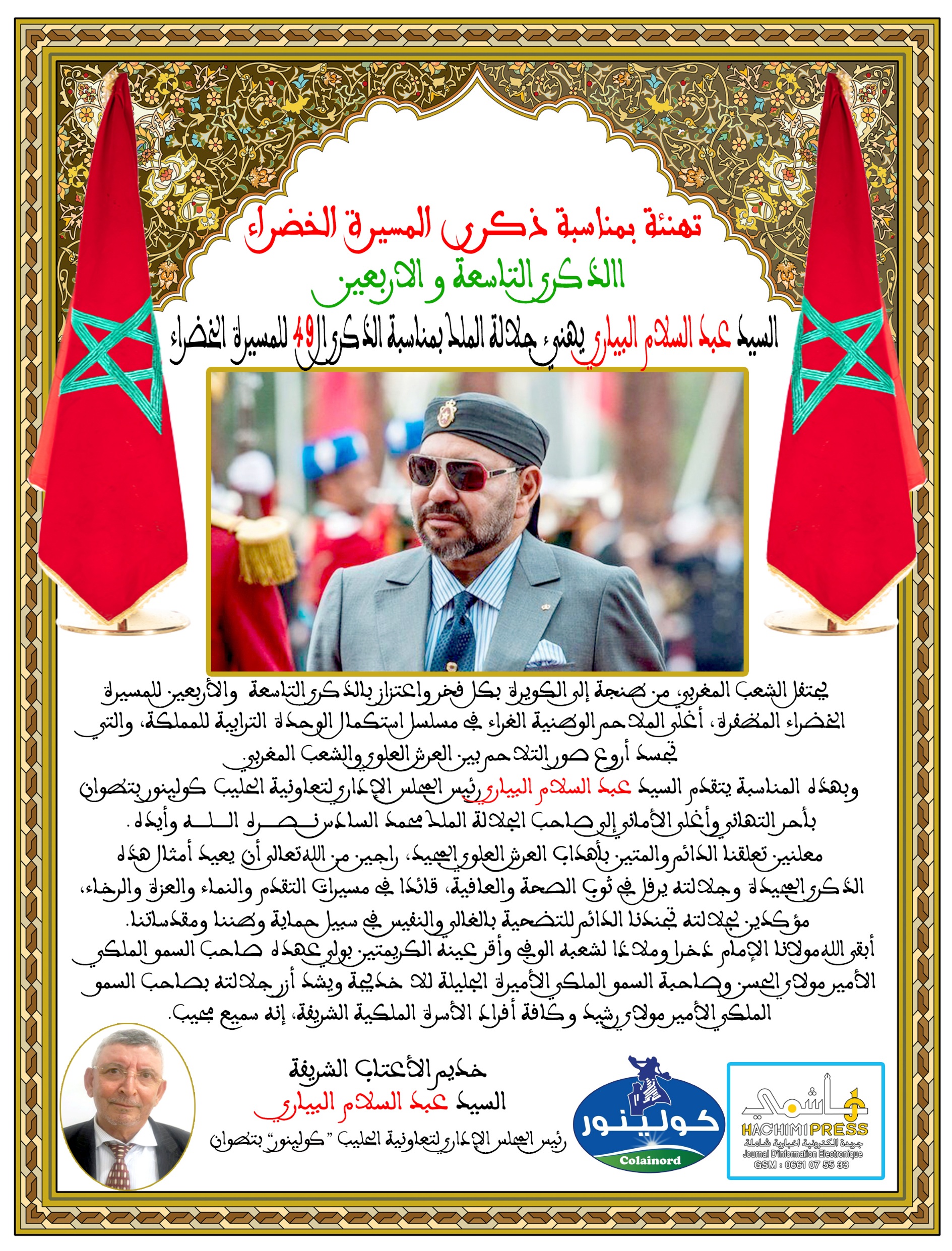 السيد عبد السلام البياري رئيس المجلس الإداري لتعاونية الحليب كولينور بتطوان يهنئ جلالة الملك بمناسبة الذكرى 49 للمسيرة الخضراء