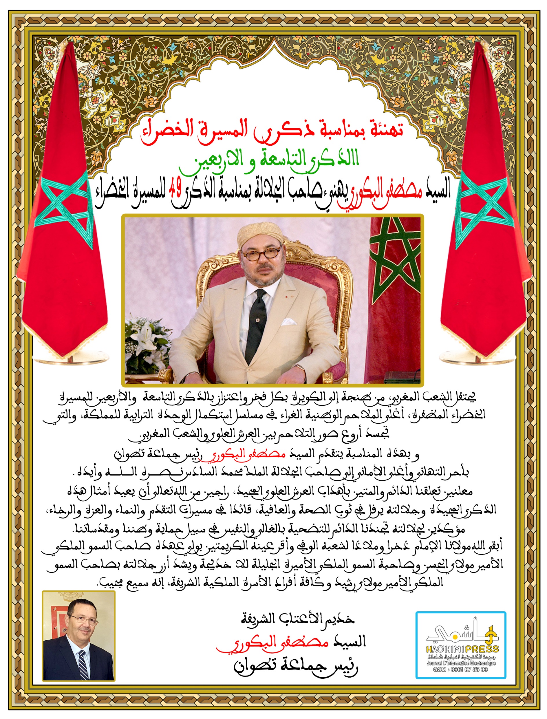 السيد مصطفى البكوري رئيس جماعة تطوان يهنئ جلالة الملك بمناسبة الذكرى 49 للمسيرة الخضراء في نوفمبر 7- 2024 0 384 انشر السيد مصطفى البكوري رئيس جماعة تطوان يهنئ جلالة الملك بمناسبة الذكرى 49 للمسيرة الخضراء 0 384 انشر