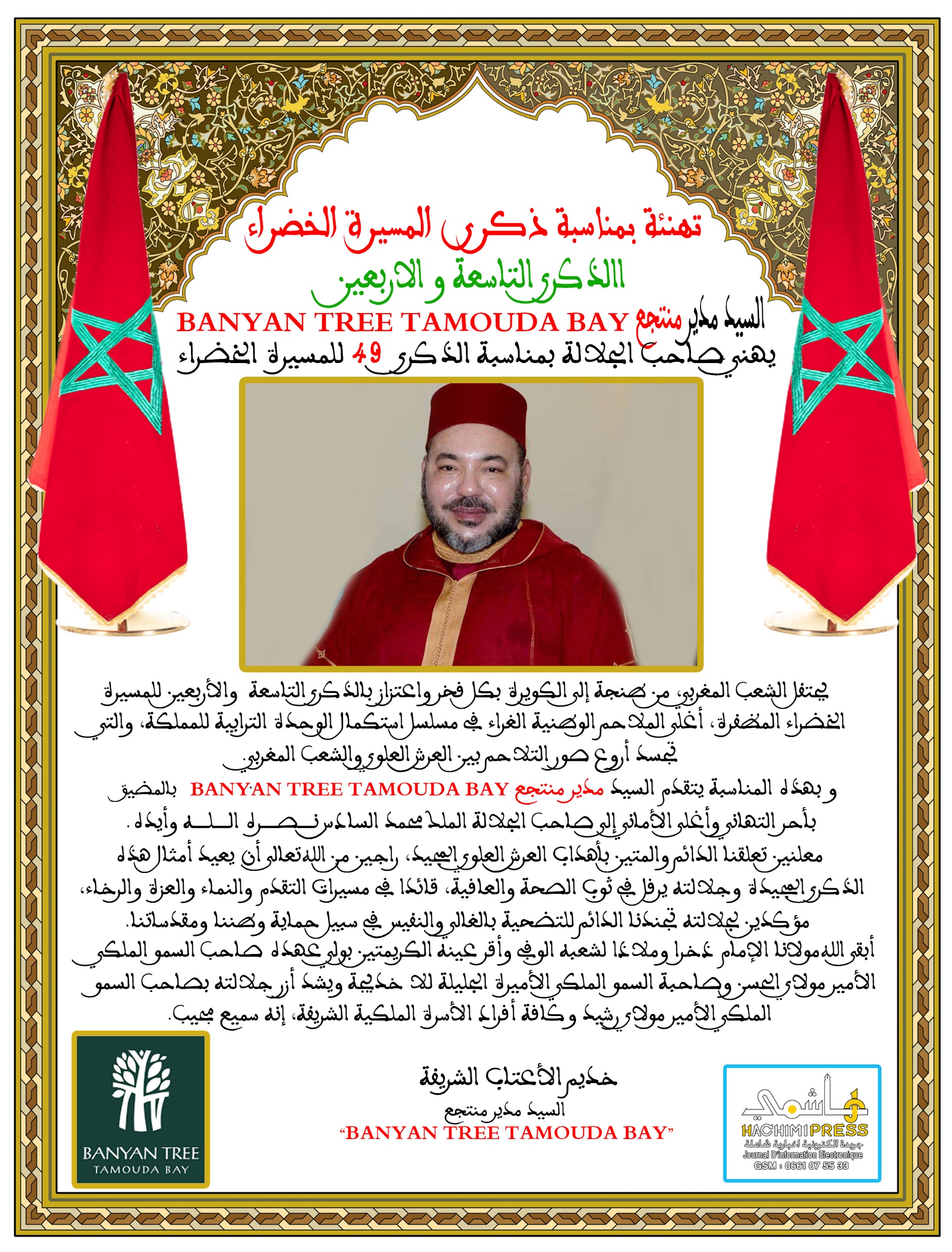 السيد مدير منتجع Banyan Tree Tamouda Bay يهنئ جلالة الملك بمناسبة الذكرى 49 للمسيرة الخضراء