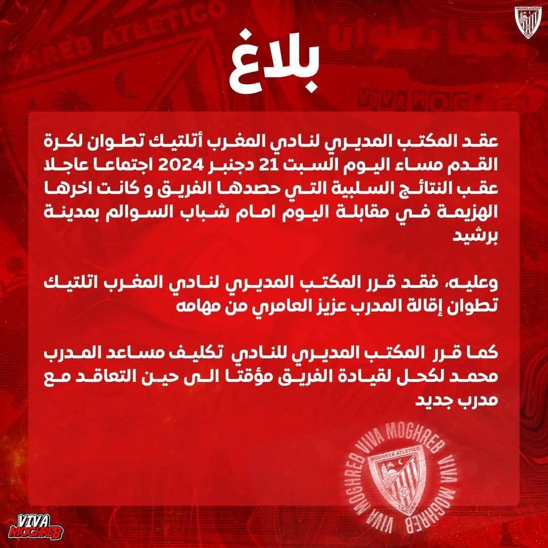 قرّرت إدارة نادي “المُغرب أتلتيك تطوان” فكّ الارتباط مع المدرب عزيز العامري، بعد سلسلة من النتائج السلبية التي أُلحِقت بالفريق في الدوري المحلي.