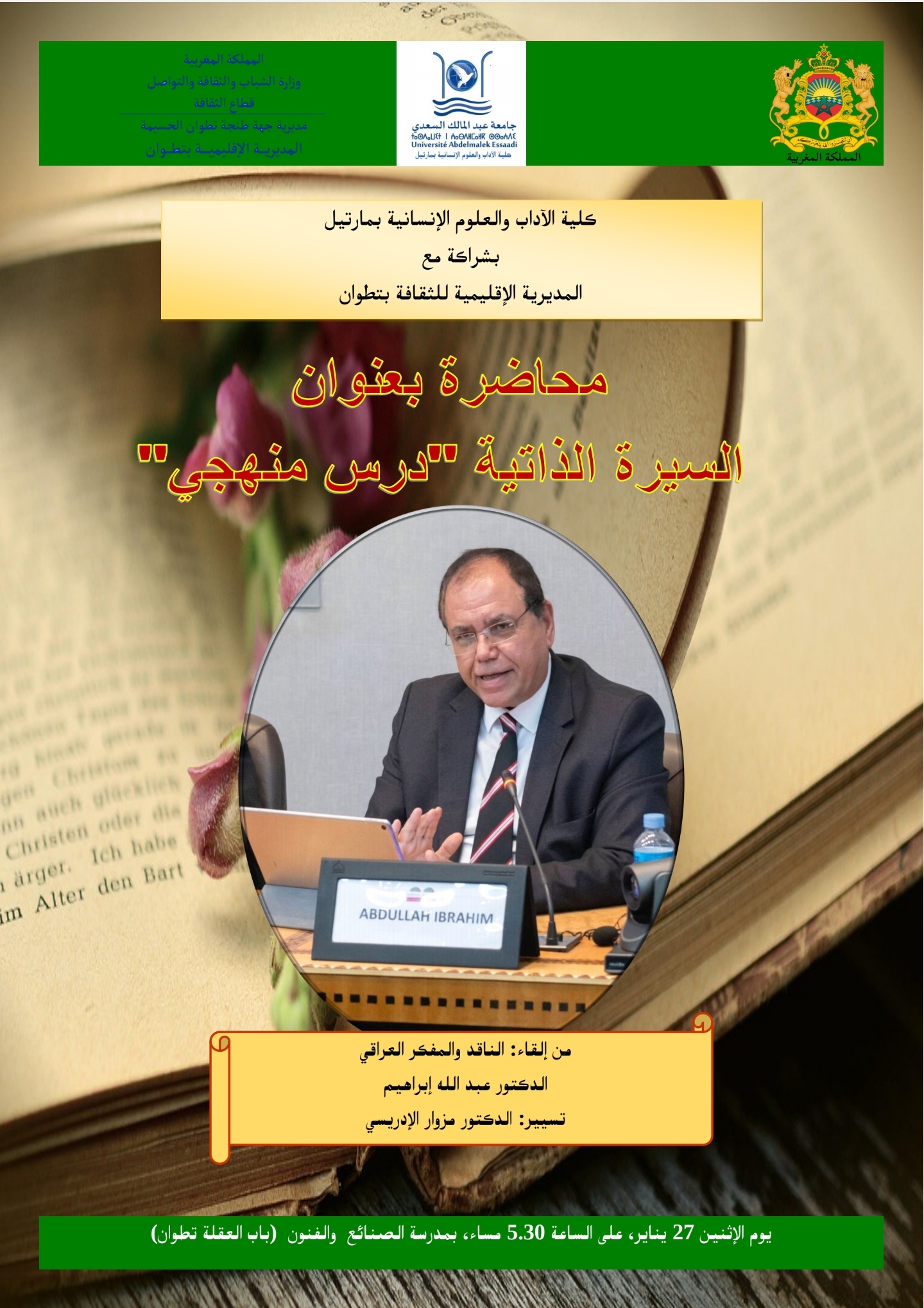 تسيير الدكتور مزوار الإدريسي، يوم الإثنين 27 يناير2025 على الساعة 5.30 مساء، بمدرسة الصنائع والفنون (باب العقلة تطوان)