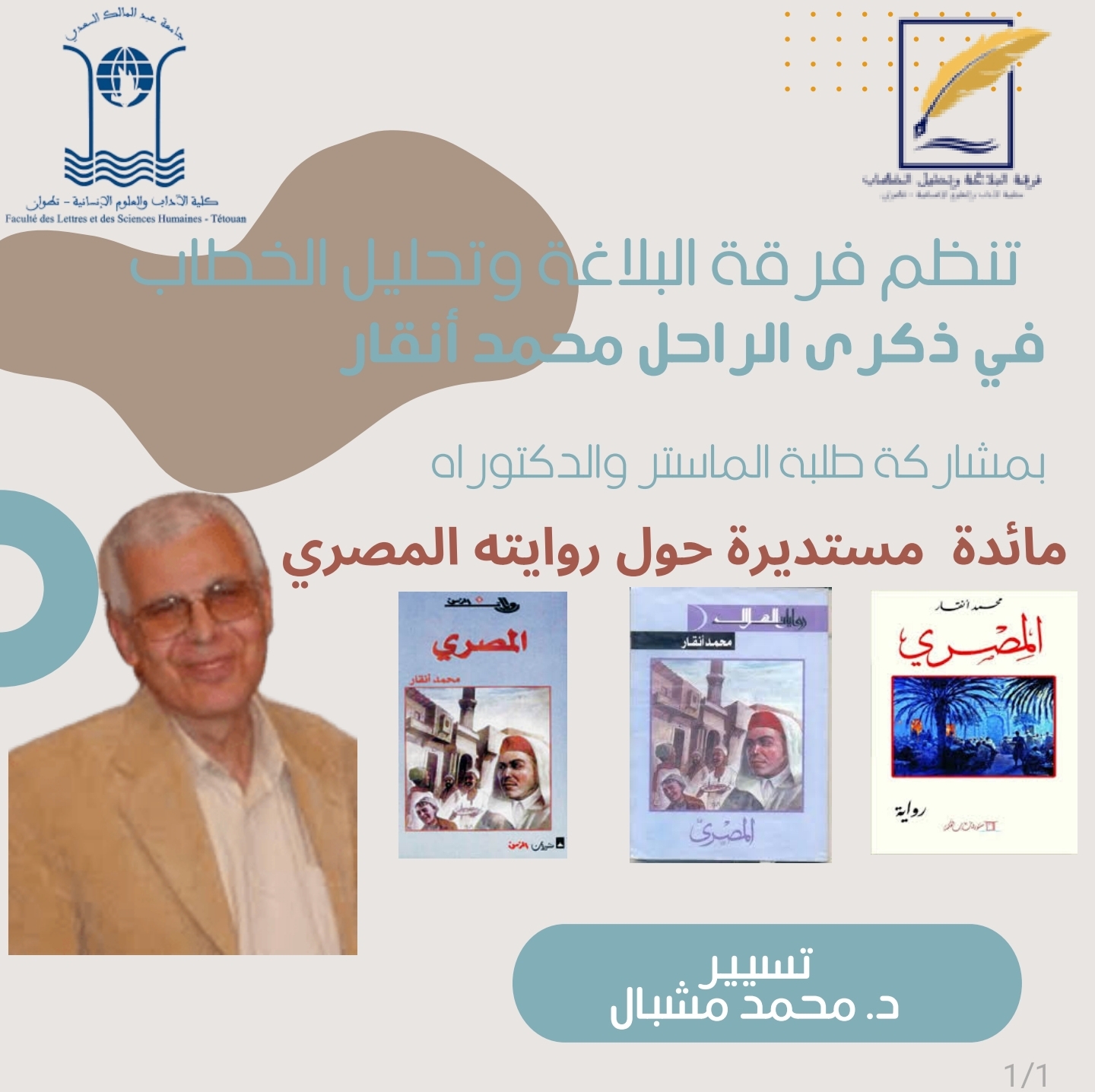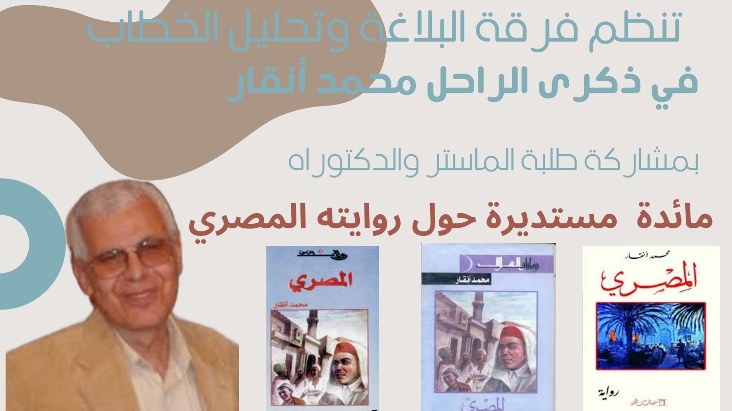 تنظم كلية الآداب والعلوم الإنسانية بتطوان بشراكة مع فرقة البلاغة وتحليل الخطاب و بمشاركة طلبة الماستر والدكتوراه مائدة مستديرة حول رواية المصري في ذكرى الراحل ” محمد انقار ”