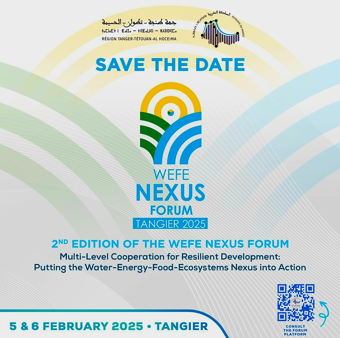 ينظم مجلس جهة طنجة-تطوان-الحسيمة الدورة الثانية من منتدى الترابط الماء-الطاقة-الغذاء-النظم البيئية (WEFE NEXUS) يومي 5 و 6 فبراير الجاري تحت شعار “التعاون متعدد المستويات من أجل تنمية مستدامة ومرنة : تفعيل الترابط بين الماء، الطاقة، الأمن الغذائي، والنظم البيئية”.