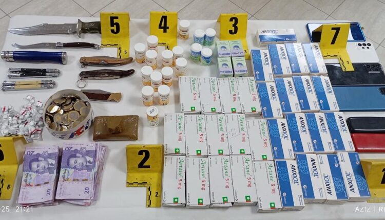 وقد جرى توقيف المشتبه فيهما بأحد أحياء مدينة طنجة، حيث أسفرت عملية الضبط والتفتيش عن العثور بحوزتهما على 1445 قرص طبي مخدر من أنواع مختلفة و100 غرام من مخدر الشيرا، علاوة على ثمانية أسلحة بيضاء ومبلغ مالي يشتبه في كونه من عائدات هذا النشاط الإجرامي.