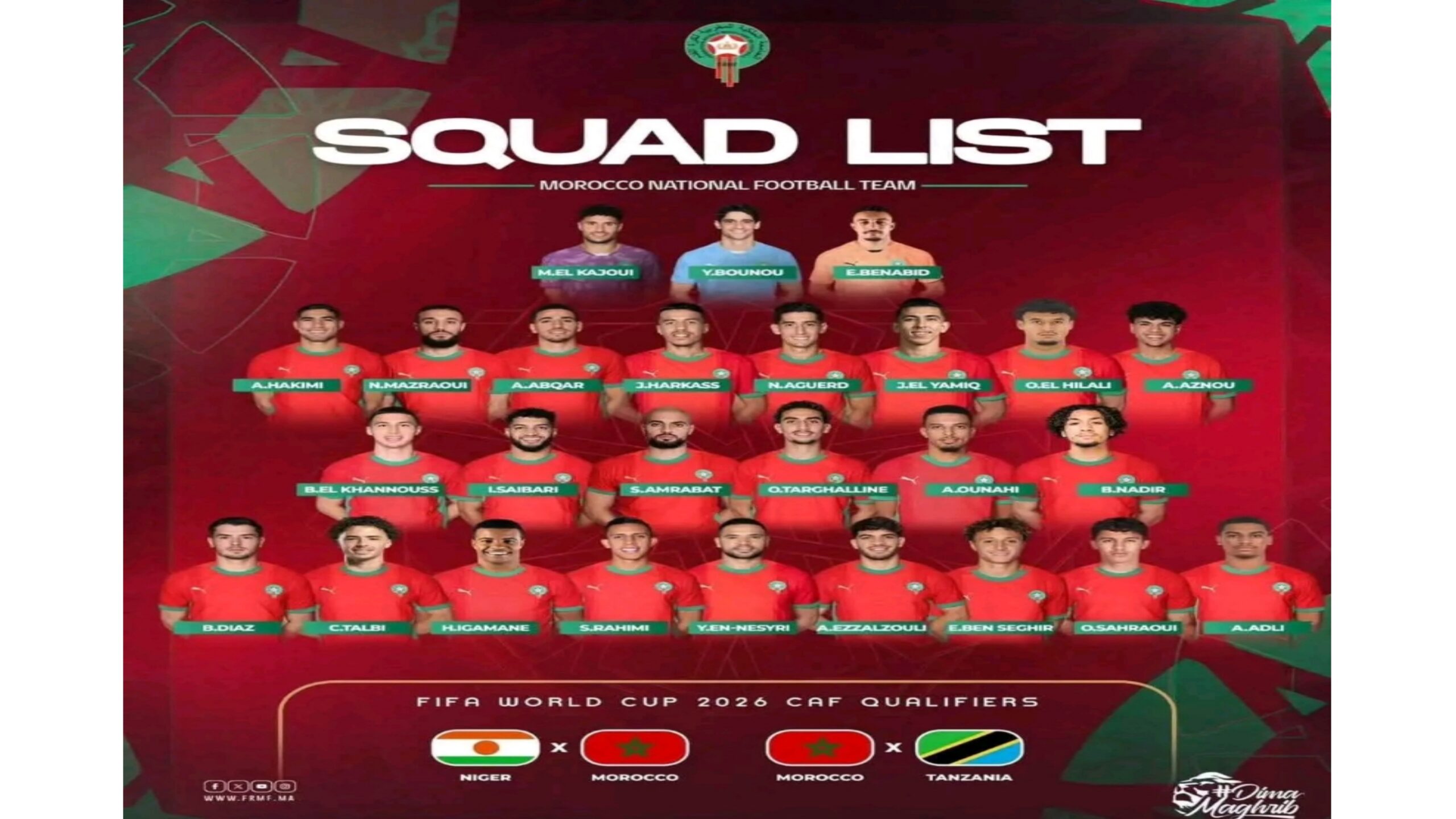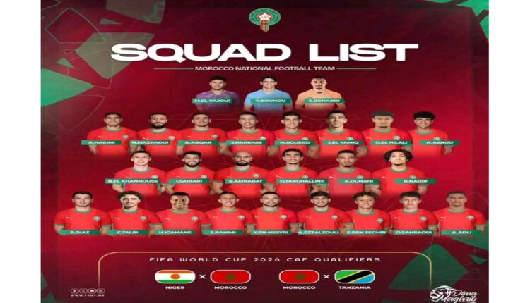 إليكم تشكيلة المنتخب الوطني المغربي التي سيستعين بها المدرب وليد الركراكي لمواجهتي النيجر وتانزانيا في تصفيات كأس العالم 2026: