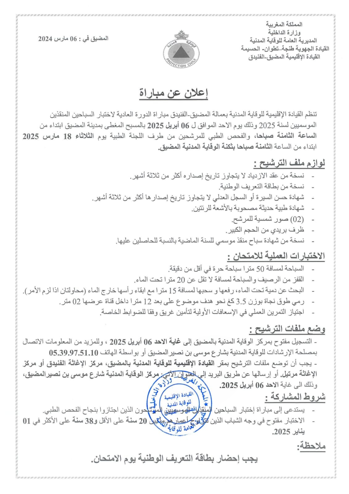 تنظم القيادة الإقليمية للوقاية المدنية بعمالة المضيق الفنيدق مباراة الدورة العادية لاختبار السباحين المنقذين الموسميين لسنة 2025، وذلك وفق التفاصيل التالية: