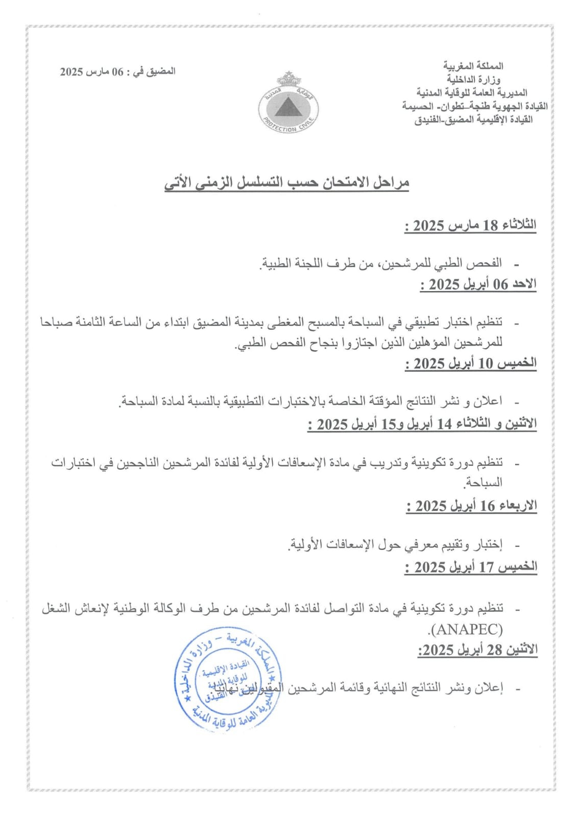 سيتم إجراء الفحص الطبي للمرشحين من طرف اللجنة الطبية يوم الثلاثاء 18 مارس 2025، ابتداءً من الساعة الثامنة صباحًا، بثكنة الوقاية المدنية بالمضيق.
