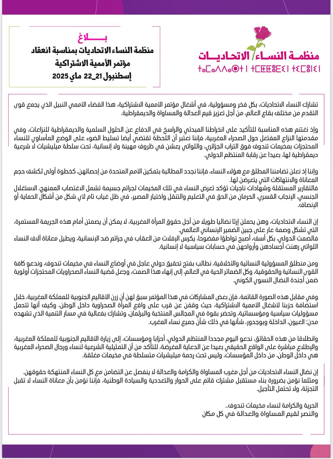 بلاغ منظمة النساء الاتحاديات بمناسبة انعقاد مؤتمر الأممية الاشتراكية – إسطنبول 21-22 ماي 2025
