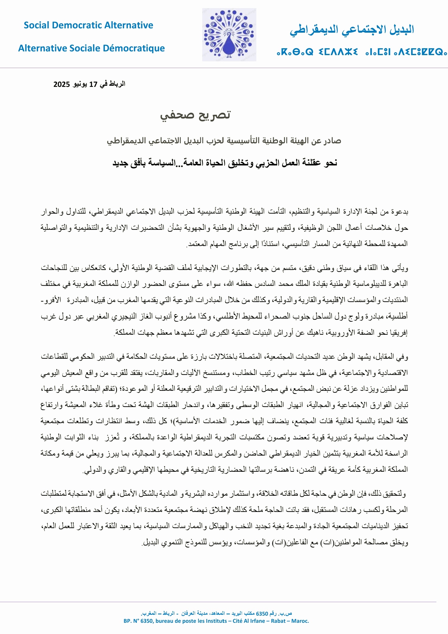وختاما تؤكد الهيئة الوطنية التأسيسية لحزب البديل الاجتماعي الديمقراطي، عزمها الراسخ على إكمال هذا المسار التأسيسي التاريخي بكل مسؤولية، ساعية لبناء قوة سياسية فاعلة قادرة على تقديم بديل حقيقي يجيب على تطلعات المغاربة ويُساهم في بناء مغرب الكرامة والعدالة والحرية للجميع.