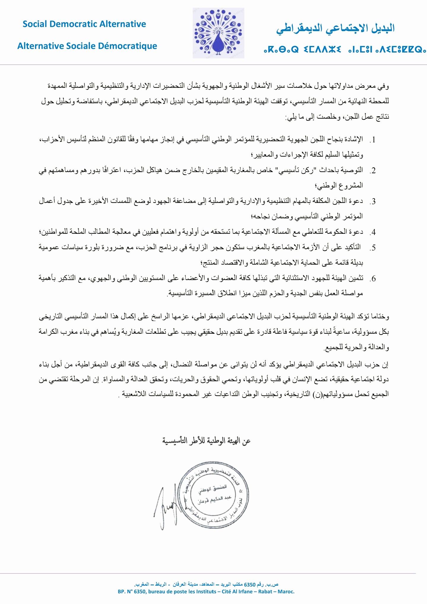 وفي معرض مداولاتها حول خلاصات سير الأشغال الوطنية والجهوية بشأن التحضيرات الإدارية والتنظيمية والتواصلية الممهدة للمحطة النهائية من المسار التأسيسي، توقفت الهيئة الوطنية التأسيسية لحزب البديل الاجتماعي الديمقراطي، باستفاضة وتحليل حول نتائج عمل اللجن، وخلصت إلى ما يلي: