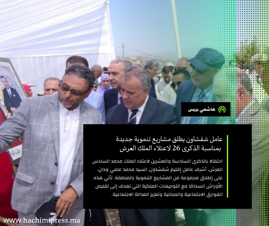 احتفالا بالذكرى السادسة والعشرين لاعتلاء الملك محمد السادس العرش، أشرف عامل إقليم شفشاون، السيد محمد علمي ودان، على إطلاق مجموعة من المشاريع التنموية بالمنطقة. تأتي هذه الأوراش انسجامًا مع التوجيهات الملكية التي تهدف إلى تقليص الفوارق الاجتماعية والمجالية وتعزيز العدالة الاجتماعية.