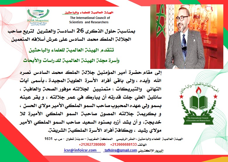 بمناسبة حلول الذكرى السادسة والعشرين لتربع صاحب الجلالة الملك محمد السادس على عرش أسلافه المنعمين تتقدم الهيئة العالمية للعلماء والباحثين وأسرة مجلة الهيئة العالمية للدراسات والأبحاث إلى مقام حضرة أمير المؤمنين جلالة الملك محمد السادس نصره الله وأيده ، وإلى باقي أفراد الأسرة العلوية المجيدة ، بأسمى آيات التهاني والتبريكات ، متمنيين لجلالته موفور الصحة والعافية ، سائلين العلي جلت قدرته أن يبارك في عمر جلالته ، ويقر عينه بسمو ولي عهده المحبوب صاحب السمو الملكي الأمير مولاي الحسن ، و بكريمة جلالته المصون صاحبة السمو الملكي الأميرة للا خديجة، وأن يشد أزره بصنوه السعيد صاحب السمو الملكي الأمير مولاي رشيد ، وبكافة أفراد الأسرة الملكية الشريفة.