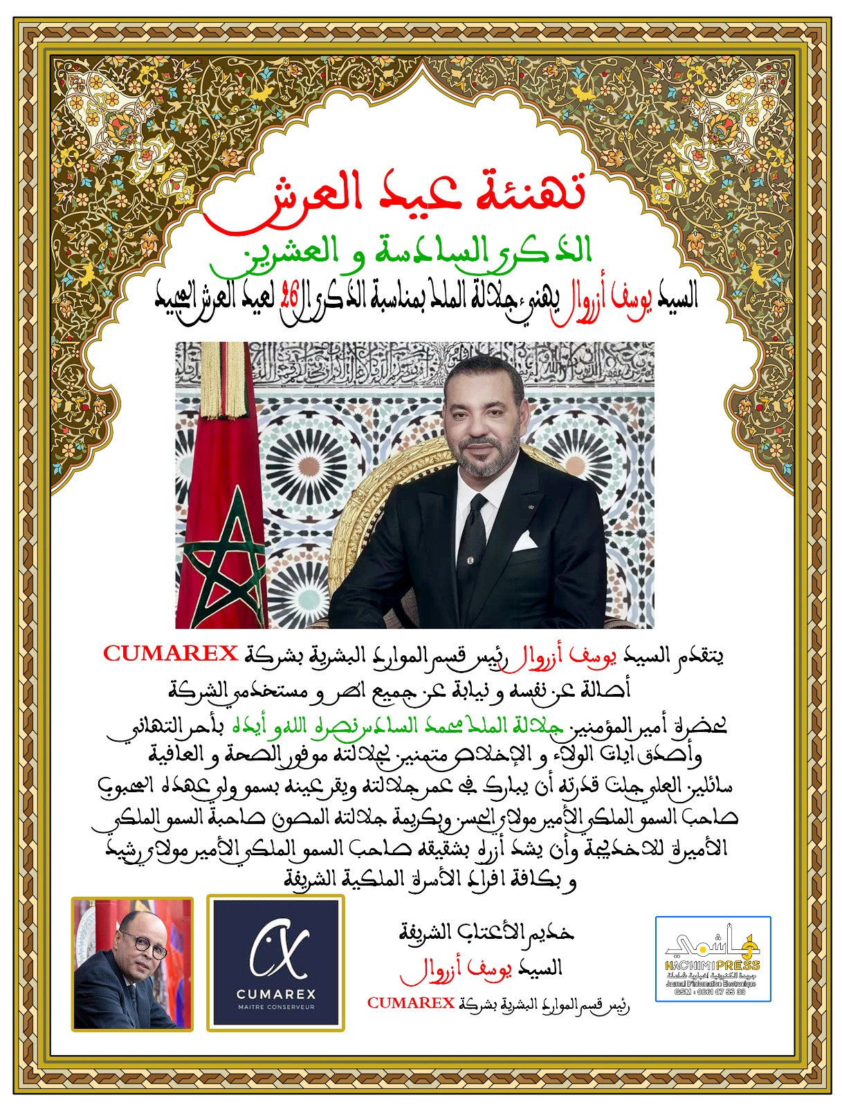 السيد يوسف ازروال رئيس قسم الموارد البشرية بشركة cumarex يهنئ جلالة الملك بمناسبة الذكرى ال26 لعيد العرش المجيد